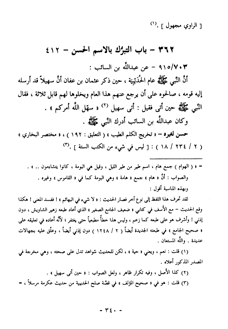 707/915- (حسن لغيره) عَنْ عَبْدِ اللَّهِ بْنِ السَّائِبِ: أَنَّ النَّبِيَّ صَلَّى اللهُ عَلَيْهِ وَسَلَّمَ عَامَ الْحُدَيْبِيَةِ، حِينَ ذَكَرَ عُثْمَانُ بْنُ عَفَّانَ أَنَّ سُهَيْلًا قَدْ أَرْسَلَهُ إِلَيْهِ قَوْمُهُ، فَصَالَحُوهُ، عَلَى أَنْ يَرْجِعَ عَنْهُمْ هَذَا الْعَامَ، وَيُخَلُّوهَا لَهُمْ قَابِلَ ثَلَاثَةٍ، فَقَالَ النَّبِيُّ صَلَّى اللهُ عَلَيْهِ وَسَلَّمَ حِينَ أَتَى. فَقِيلَ: أَتَى سُهَيْلٌ (¬1) "سَهَّلَ اللَّهُ أَمْرَكُمْ". وَكَانَ عَبْدُ اللَّهِ بْنُ السَّائِبِ أَدْرَكَ النَّبِيَّ صَلَّى اللهُ عَلَيْهِ وَسَلَّمَ.