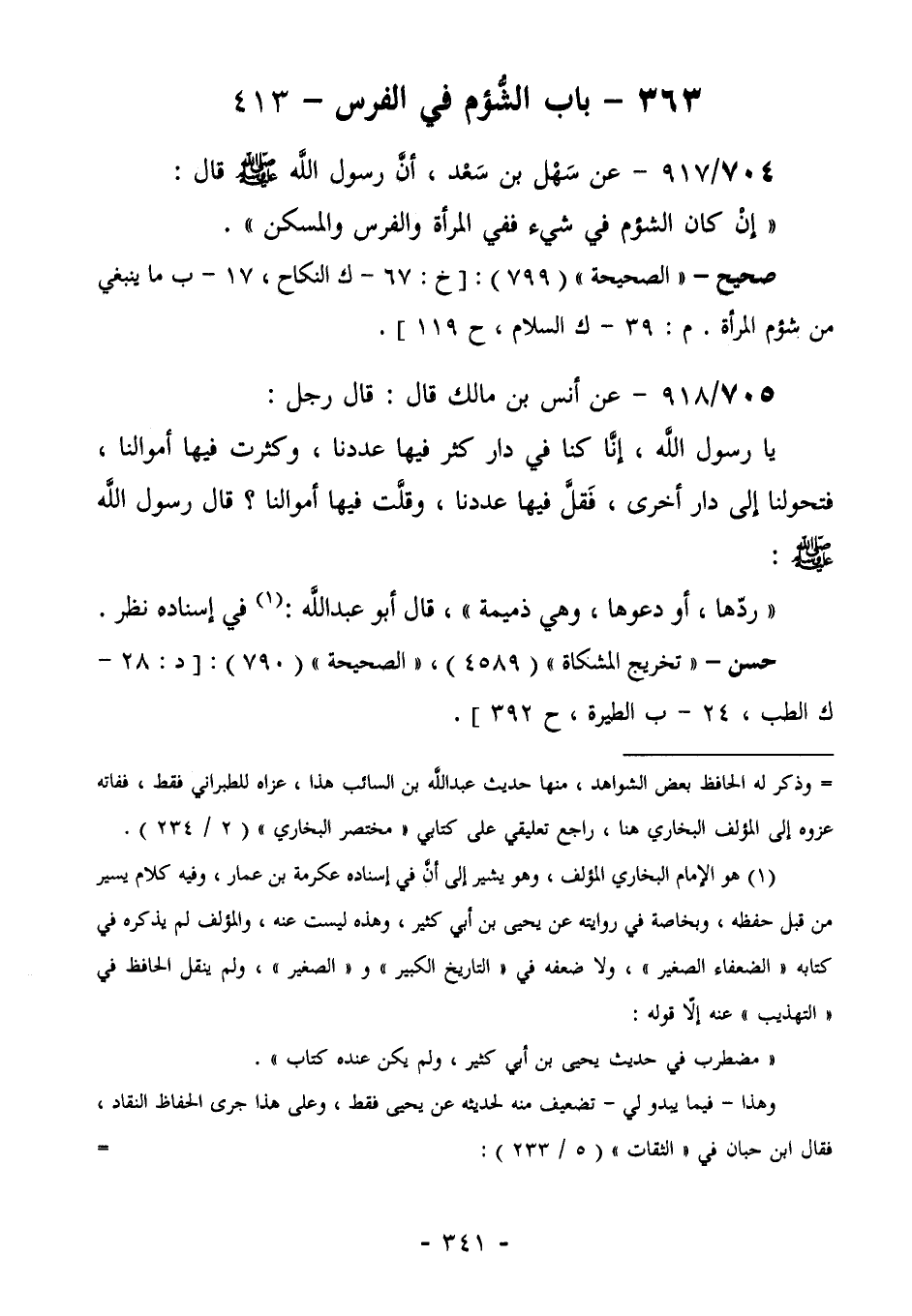 708/917 (صحيح) عَنْ سَهْلِ بْنِ سَعْدٍ، إِنْ رَسُولَ اللَّهِ صَلَّى اللهُ عَلَيْهِ وَسَلَّمَ قَالَ: " إِنْ كَانَ الشُّؤْمُ فِي شَيْءٍ، فَفِي الْمَرْأَةِ، وَالْفَرَسِ، والمسكن".