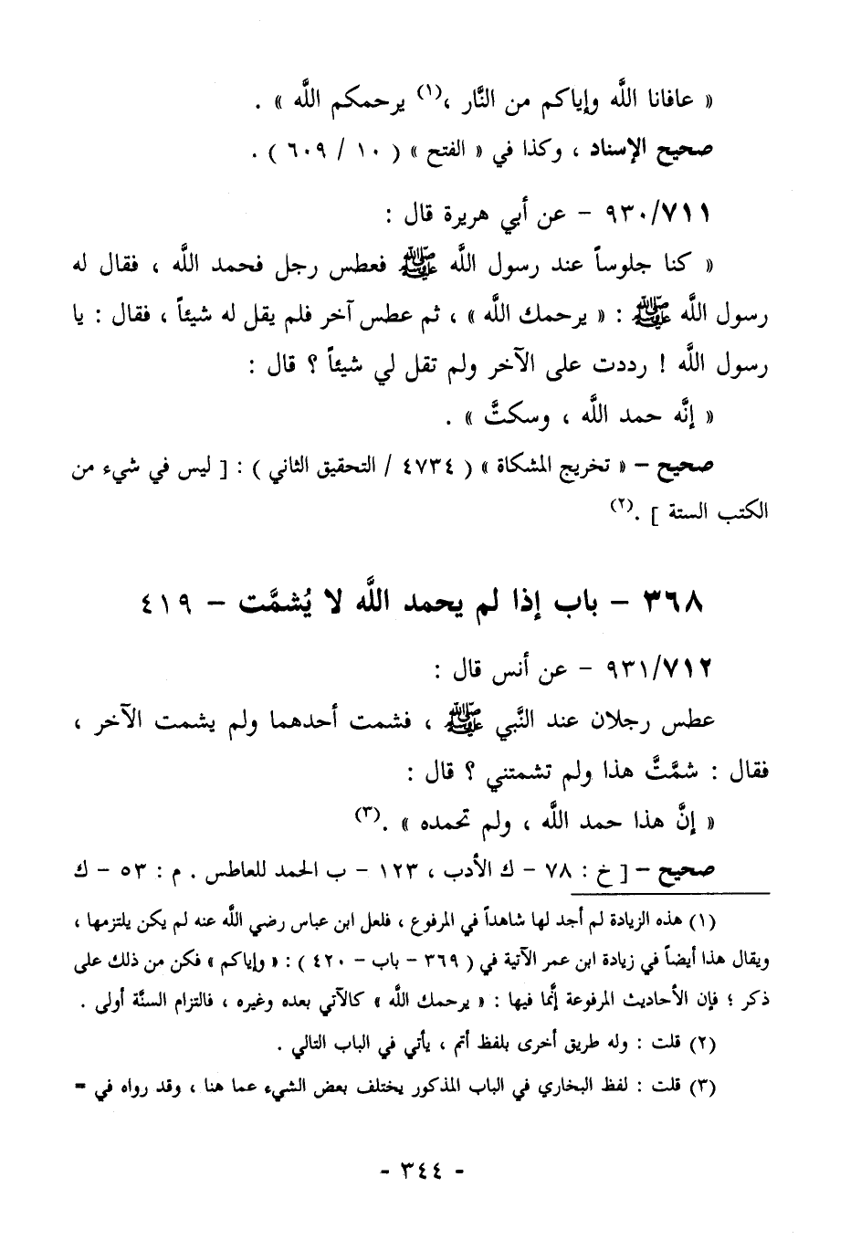 716/931- عن أنس قال: عَطَسَ رَجُلَانِ عِنْدَ النَّبِيِّ صَلَّى اللهُ عَلَيْهِ وَسَلَّمَ، فَشَمَّتَ أَحَدَهُمَا، وَلَمْ يُشَمِّتِ الْآخَرَ، فَقَالَ: شَمَّتَّ هَذَا وَلَمْ تُشَمِّتْنِي؟ قَالَ: " إِنَّ هَذَا حَمِدَ اللَّهَ، وَلَمْ تحمدَهُ" (¬2) .