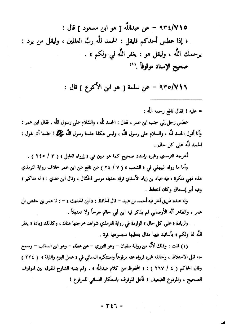 719/934- عن عبد الله [هو ابن مسعود] قَالَ: " إِذَا عَطَسَ أَحَدُكُمْ فَلْيَقُلِ: الْحَمْدُ لِلَّهِ رَبِّ الْعَالَمِينَ. وَلْيَقُلْ مَنْ يَرُدُّ: يَرْحَمُكَ اللَّهُ. ولْيَقُل هُوَ: يَغْفِرُ اللَّهُ لِي وَلَكُمْ".
