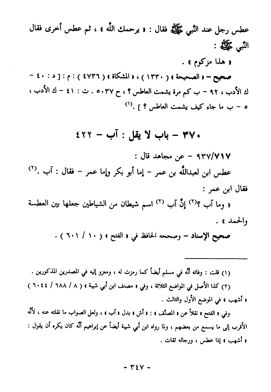 وفي " الفتح" نقلاً عن " المصنف" "أش" بدل "آب"، ولعل الصواب ما نقلته عنه، لأنه أقرب إلى ما يسمع من بعضهم ولما رواه ابن أبي شيبة أيضاً عن إبراهيم أنه كان يكره أن يقول: " أشهب" إذا عطس، ورجاله ثقات.