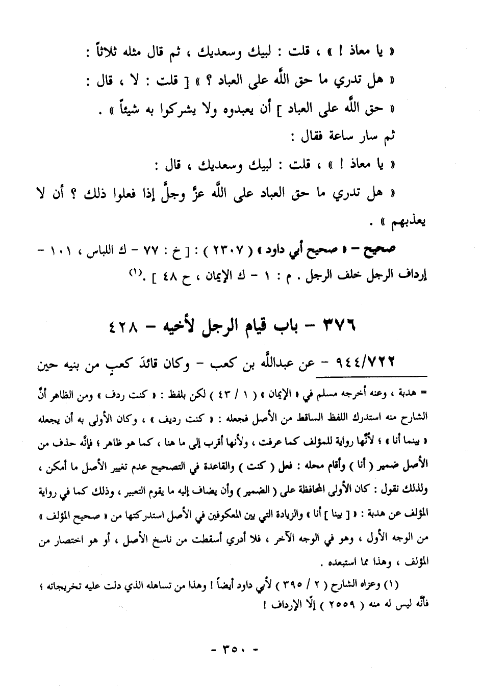 " يَا مُعَاذُ! "، قُلْتُ: لَبَّيْكَ وَسَعْدَيْكَ، ثم قال مثلها ثَلَاثًا: " هَلْ تَدْرِي مَا حَقُّ اللَّهِ عَلَى الْعِبَادِ؟ [قُلْتُ: لَا، قال: حق الله على العباد] أَنْ يَعْبُدُوهُ وَلَا يُشْرِكُوا بِهِ شَيْئًا". ثُمَّ سَارَ سَاعَةً، فَقَالَ: " يَا مُعَاذُ! "، قُلْتُ: لَبَّيْكَ وَسَعْدَيْكَ، قَالَ: " هَلْ تَدْرِي مَا حَقُّ الْعِبَادِ عَلَى اللَّهِ عَزَّ وَجَلَّ إِذَا فَعَلُوا ذَلِكَ؟ أَنْ لَا يُعَذِّبَهُمْ".