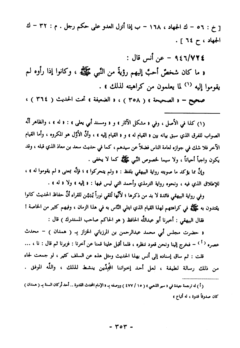 728/946 (صحيح) عَنْ أَنَسٍ قَالَ: "مَا كَانَ شَخْصٌ أَحَبَّ إِلَيْهِمْ رُؤْيَةً مِنَ النَّبِيَّ صَلَّى اللهُ عَلَيْهِ وَسَلَّمَ، وَكَانُوا إِذَا رَأَوْهُ لَمْ يَقُومُوا إِلَيْهِ (¬1) ، لِمَا يَعْلَمُونَ مِنْ كَرَاهِيَتِهِ لذلك".