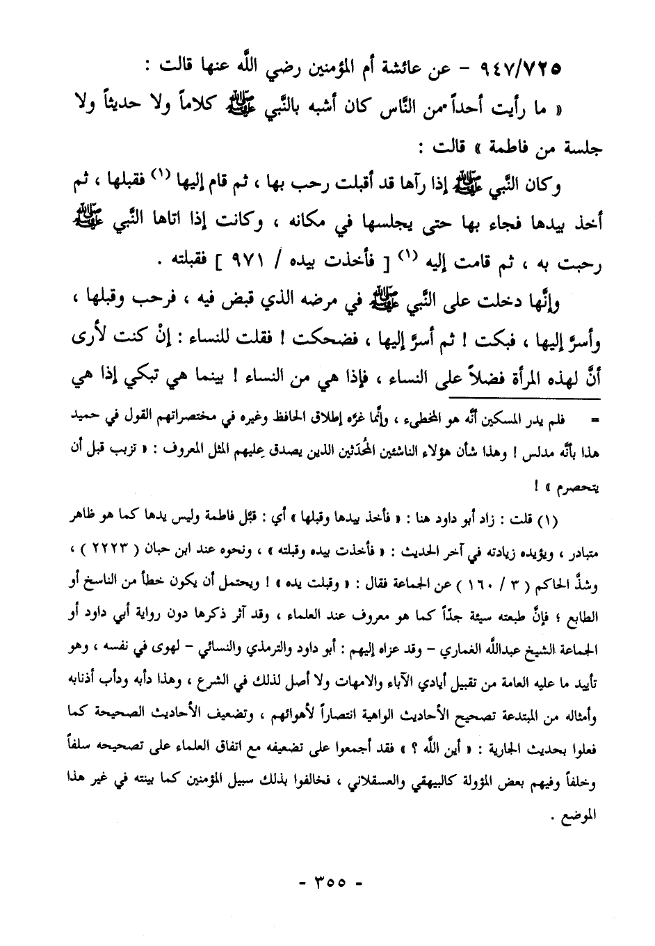 (¬1) قلت: زاد أبو داود هنا: " فأخذ بيدا، وقبلها " أي: قبل فاطمة وليس يدها كما هو ظاهر متبادر، ويؤيده زيادته في آخر الحديث: " فأخذت بيده، وقبلته" ونحوه عند ابن حبان (2223) ، وشذ الحاكم (3/160) عن الجماعة فقال: " وقبلت يده"! ويحتمل أن يكون خطأ من الناسخ أو الطابع؛ فإن طبعته سيئة جداً كما هو معروف عند العلماء، وقد آثر ذكرها دون رواية أبي داود أو الجماعة الشيخ عبد الله الغماري- وقد عزاه إليهم" أبو داود والترمذي والنسائي- في رسالته " إعلام النبيل بجواز التقبيل" لهوى في نفسه وهو تأييد ما عليه العامة من تقبيل أيادي الآباء والأمهات ولا أصل لذلك في الشرع، وهذا دأبه ودأب أذنابه وأمثاله من المبتدعة تصحيح الأحاديث الواهية انتصاراً لأهوائهم، وتضعيف الأحاديث الصحيحة كما فعلوا بحيث الجارية: "أين الله؟ " فقد أجمعوا على تضعيفه مع اتفاق العلماء على تصحيحه سلفاً وخلفاً، وفيهم بعض المؤولة كالبيهقي والعسقلاني، فخالفوا بذلك سبيل المؤمنين كما بينته في غير هذا الموضع.
