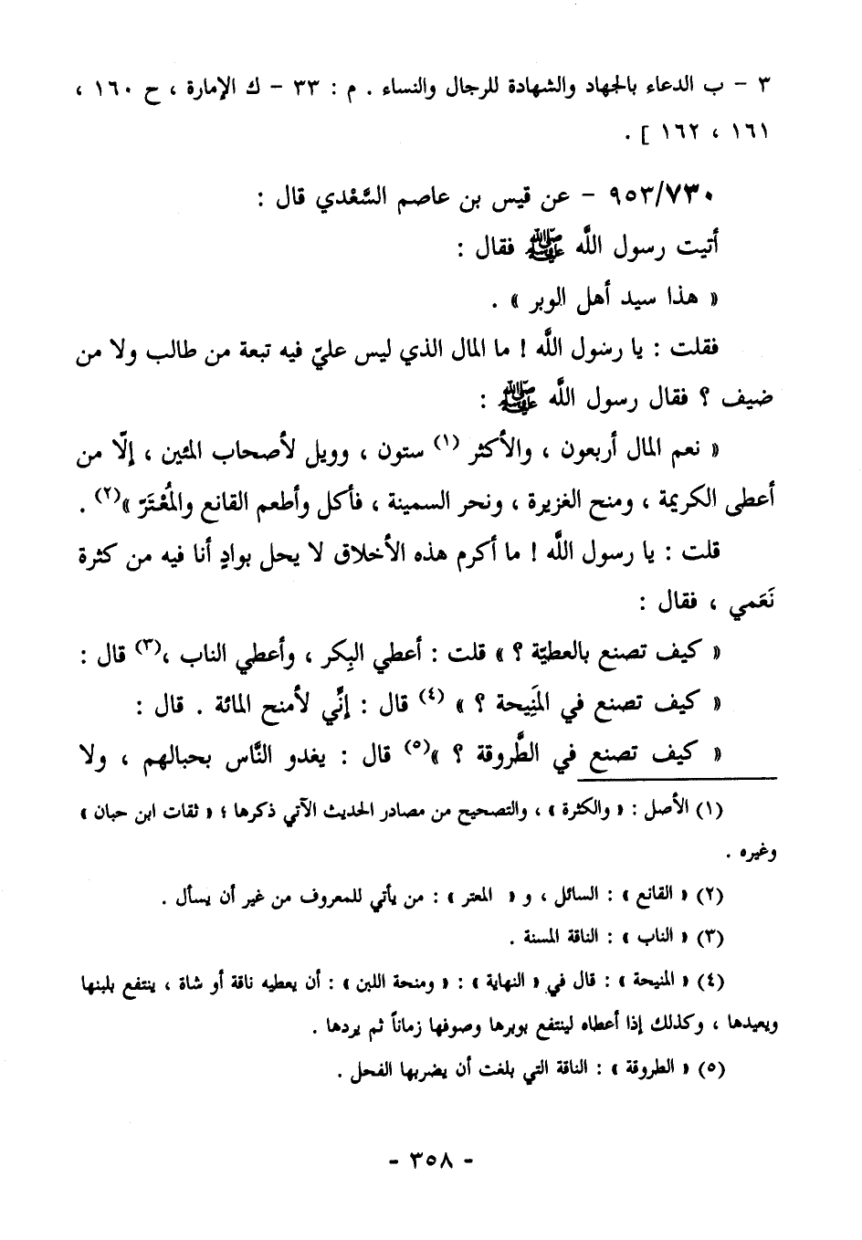 734/953 (حسن لغيره) عَنْ قَيْسِ بْنِ عَاصِمٍ السَّعْدِيِّ قَالَ: أَتَيْتُ رَسُولَ اللَّهِ صَلَّى اللهُ عَلَيْهِ وَسَلَّمَ فَقَالَ: " هَذَا سَيِّدُ أَهْلِ الْوَبَرِ". فَقُلْتُ: يَا رَسُولَ اللَّهِ! مَا الْمَالُ الَّذِي لَيْسَ عَلَيَّ فِيهِ تَبِعَةٌ مِنْ طَالِبٍ، وَلَا مِنْ ضَيْفٍ؟ فَقَالَ رَسُولَ اللَّهِ صَلَّى اللهُ عَلَيْهِ وَسَلَّمَ: "نِعْمَ الْمَالُ أَرْبَعُونَ، وَالْأَكْثَرُ (¬1) سِتُّونَ، وَوَيْلٌ لِأَصْحَابِ الْمِئِينَ، إِلَّا مَنْ أَعْطَى الْكَرِيمَةَ، وَمَنَحَ الْغَزِيرَةَ، وَنَحَرَ السَّمِينَةَ، فَأَكَلَ، وَأَطْعَمَ الْقَانِعَ وَالْمُعْتَرَّ" (¬2) . قُلْتُ: يَا رَسُولَ اللَّهِ! مَا أَكْرَمُ هَذِهِ الْأَخْلَاقِ لَا يُحَلُّ بِوَادٍ أَنَا فِيهِ مِنْ كَثْرَةِ نَعَمِي. فَقَالَ: " كَيْفَ تَصْنَعُ بِالْعَطِيَّةِ؟ " قُلْتُ: أُعْطِي الْبِكْرَ، وَأُعْطِي النَّابَ (¬3) قَالَ: " كَيْفَ تَصْنَعُ فِي الْمَنِيحَةِ" (¬4) قَالَ: إِنِّي لَأَمْنَحُ النَّاقَةَ. قَالَ: " كَيْفَ تَصْنَعُ فِي الطَّرُوقَةِ؟ " (¬5) قال: يغدوا الناس بحبالهم، ولا