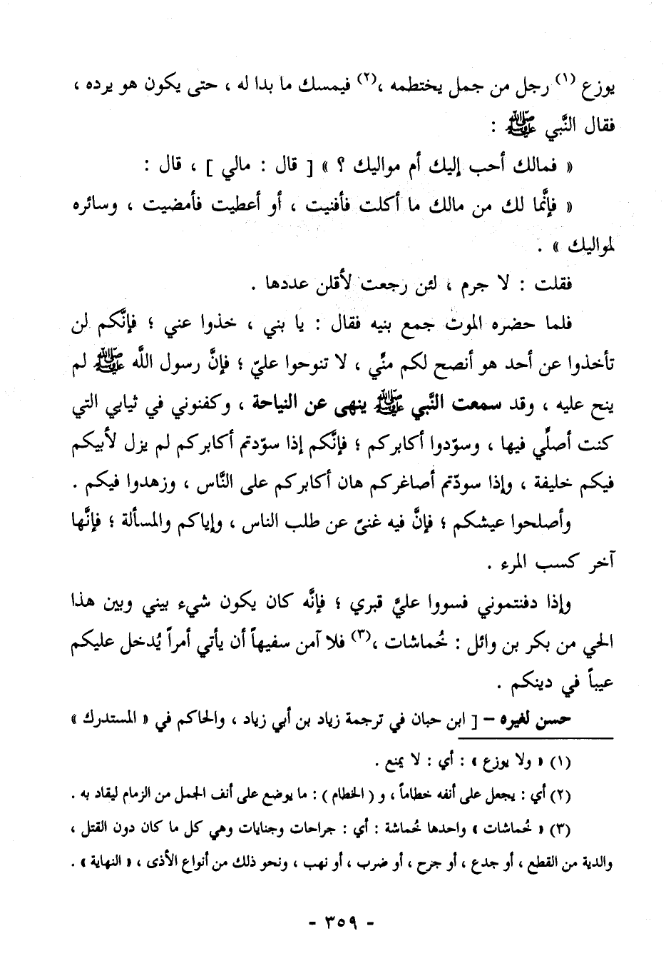 يُوزَعُ (¬1) رَجُلٌ مِنْ جَمَلٍ يَخْتَطِمُهُ (¬2) ، فَيُمْسِكُهُ مَا بَدَا لَهُ، حَتَّى يَكُونَ هُوَ يَرُدَّهُ، فَقَالَ النَّبِيُّ صَلَّى اللهُ عَلَيْهِ وَسَلَّمَ: " فَمَالُكَ أَحَبُّ إِلَيْكَ، أَمْ مَالُ مَوَالِيكَ؟ ". [قَالَ: مَالِي] . قَالَ: " فَإِنَّمَا لَكَ مِنْ مَالِكَ مَا أَكَلْتَ فَأَفْنَيْتَ، أَوْ أَعْطَيْتَ فَأَمْضَيْتَ، وَسَائِرُهُ لِمَوَالِيكَ". فَقُلْتُ: لَا جَرَمَ، لَئِنْ رَجَعْتُ لَأُقِلَّنَّ عَدَدَهَا. فَلَمَّا حَضَرَهُ الْمَوْتُ جَمَعَ بَنِيهِ، فَقَالَ: يَا بَنِيَّ! خُذُوا عَنِّي؛ فَإِنَّكُمْ لَنْ تَأْخُذُوا عَنْ أحدٍ هُوَ أَنْصَحُ لَكُمْ مِنِّي: لَا تَنُوحُوا عَلَيَّ؛ فَإِنَّ رَسُولَ اللَّهِ صَلَّى اللهُ عَلَيْهِ وَسَلَّمَ لَمْ يُنَحْ عَلَيْهِ، وَقَدْ سَمِعْتُ النَّبِيَّ صَلَّى اللهُ عَلَيْهِ وَسَلَّمَ يَنْهَى عَنِ النِّيَاحَةِ، وَكَفِّنُونِي فِي ثِيَابِي الَّتِي كُنْتُ أُصَلِّي فِيهَا، وَسَوِّدُوا أَكَابِرَكُمْ؛ فَإِنَّكُمْ إِذَا سَوَّدْتُمْ أَكَابِرَكُمْ لَمْ يَزَلْ لِأَبِيكُمْ فِيكُمْ خَلِيفَةٌ، وَإِذَا سَوَّدْتُمْ أَصَاغِرَكُمْ هَانَ أَكَابِرُكُمْ عَلَى النَّاسِ، وزهدوا فيكم.
