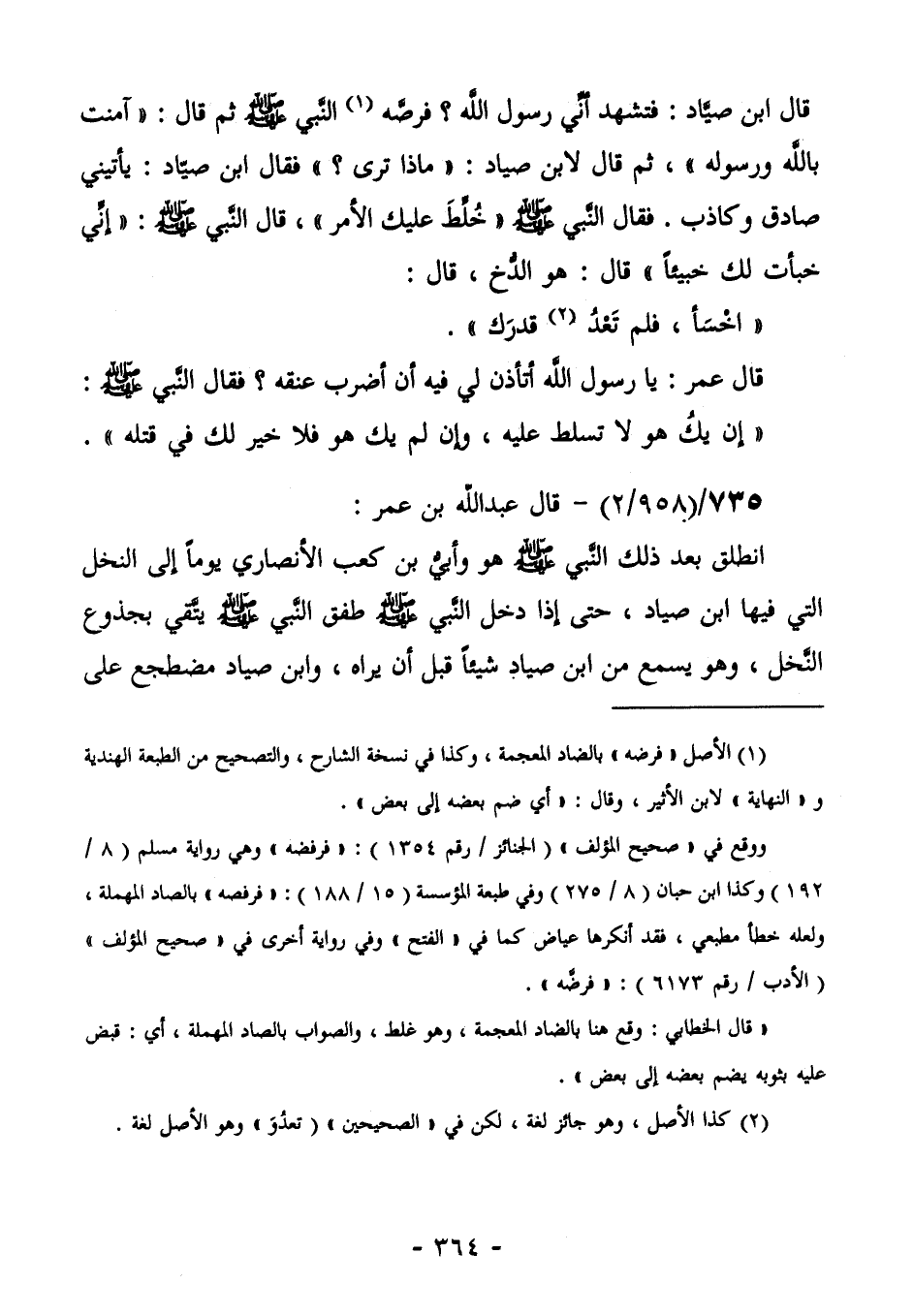 739/ (958/2) - قَالَ عَبْدُ اللَّهِ بْنُ عُمَرَ: انْطَلَقَ بَعْدَ ذَلِكَ النَّبِيُّ صَلَّى اللهُ عَلَيْهِ وَسَلَّمَ هُوَ وَأُبَيُّ بْنُ كَعْبٍ الْأَنْصَارِيُّ يَوْمًا إِلَى النَّخْلِ الَّتِي فِيهَا ابْنُ صَيَّادٍ، حَتَّى إِذَا دَخَلَ النَّبِيُّ صَلَّى اللهُ عَلَيْهِ وَسَلَّمَ طَفِقَ النَّبِيُّ صَلَّى اللهُ عَلَيْهِ وَسَلَّمَ يَتَّقِي بِجُذُوعِ النَّخْلِ، وَهُوَ يَسْمَعُ مِنِ ابْنِ صَيَّادٍ شَيْئًا قَبْلَ أَنْ يَرَاهُ، وَابْنُ صَيَّادٍ مُضْطَجِعٌ عَلَى