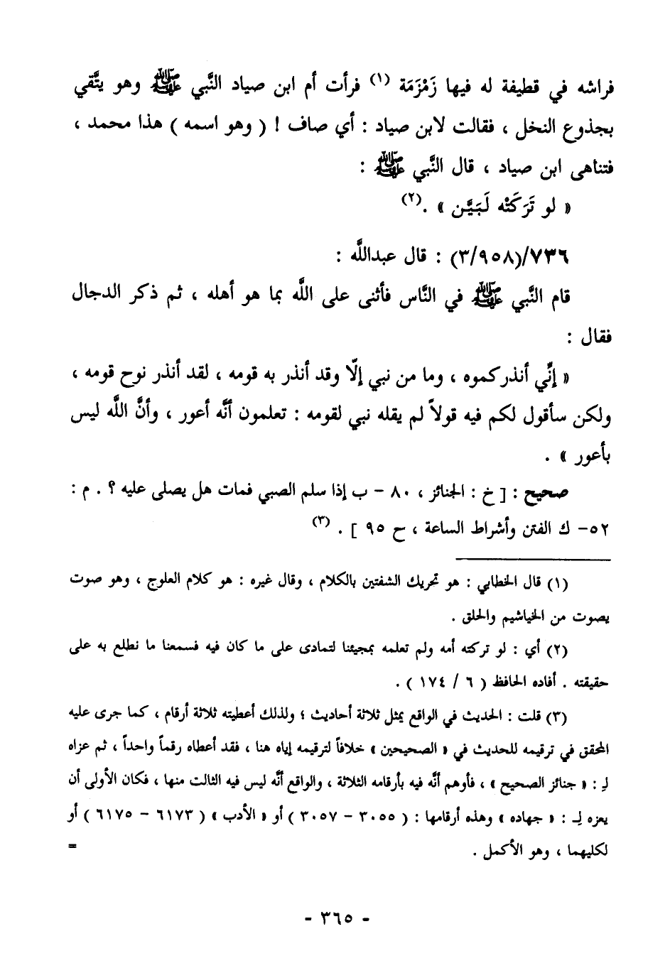فِرَاشِهِ فِي قَطِيفَةٍ لَهُ فِيهَا زَمْزَمَةٌ (¬1) فَرَأَتْ أُمُّ ابْنِ صَيَّادٍ النَّبِيَّ صَلَّى اللهُ عَلَيْهِ وَسَلَّمَ وَهُوَ يَتَّقِي بِجُذُوعِ النَّخْلِ، فَقَالَتْ لابن صياد: أين صَافُ! (وَهُوَ اسْمُهُ) هَذَا مُحَمَّدٌ، فَتَنَاهَى ابْنُ صَيَّادٍ. قَالَ النَّبِيُّ صَلَّى اللهُ عَلَيْهِ وَسَلَّمَ: " لَوْ تركته لبين" (¬2) .