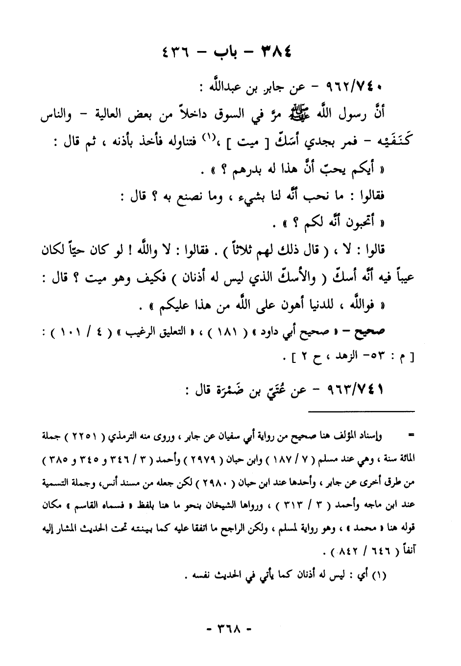 744/962 (صحيح) عَنْ جَابِرِ بْنِ عَبْدِ اللَّهِ: أَنَّ رَسُولَ اللَّهِ صَلَّى اللهُ عَلَيْهِ وَسَلَّمَ مَرَّ فِي السُّوقِ دَاخِلًا مِنْ بَعْضِ الْعَالِيَةِ- وَالنَّاسُ كنفيه، فمر بجدي أسك (¬1) [ميت] ، فَتَنَاوَلَهُ فَأَخَذَ بِأُذُنِهِ، ثُمَّ قَالَ: "أَيُّكُمْ يُحِبُّ أَنَّ هَذَا لَهُ بِدِرْهَمٍ؟ " فَقَالُوا: مَا نُحِبُّ أَنَّهُ لَنَا بِشَيْءٍ، وَمَا نَصْنَعُ بِهِ؟ قَالَ: "أَتُحِبُّونَ أَنَّهُ لَكُمْ؟ ". قَالُوا: لَا. (قَالَ ذَلِكَ لَهُمْ ثَلَاثًا) . فَقَالُوا: لَا وَاللَّهِ! لَوْ كَانَ حَيًّا لَكَانَ عَيْبًا فِيهِ أَنَّهُ أَسَكُّ (وَالْأَسَكُّ الَّذِي لَيْسَ لَهُ أُذُنَانِ) فَكَيْفَ وَهُوَ مَيِّتٌ؟ قَالَ: " فَوَاللَّهِ، لَلدُّنْيَا أَهْوَنُ عَلَى اللَّهِ من هذا عليكم".