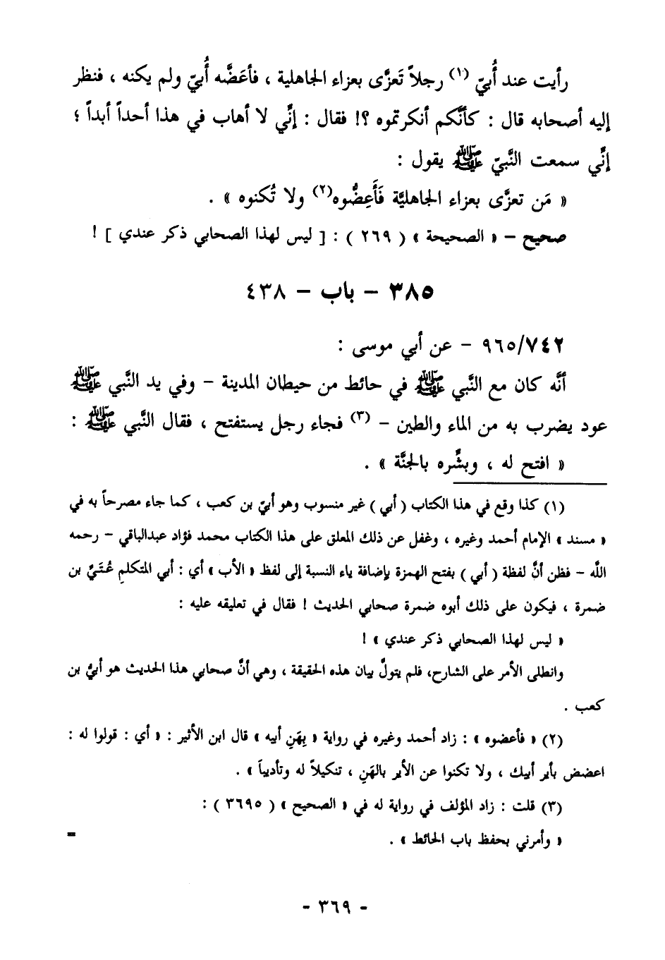 (¬1) كذا وقع في هذا الكتاب (أبي) غير منسوب وهو ابن أبي بن كعب، كما جاء مصرحاً في " مسند" الإمام أحمد وغيره، وغفل عن ذلك محمد فؤاد عبد الباقي - رحمه الله- فظن أن لفظة (أبي) بفتح الهمزة بإضافة ياء النسبة إلى لفظ (الأب) أي: أبي المتكلم عتي بن ضمرة، فيكون على ذلك أبوه ضمرة صحابي الحديث! فقال في تعليقه عليه " ليس هذا الصحابي ذكر عندي"!