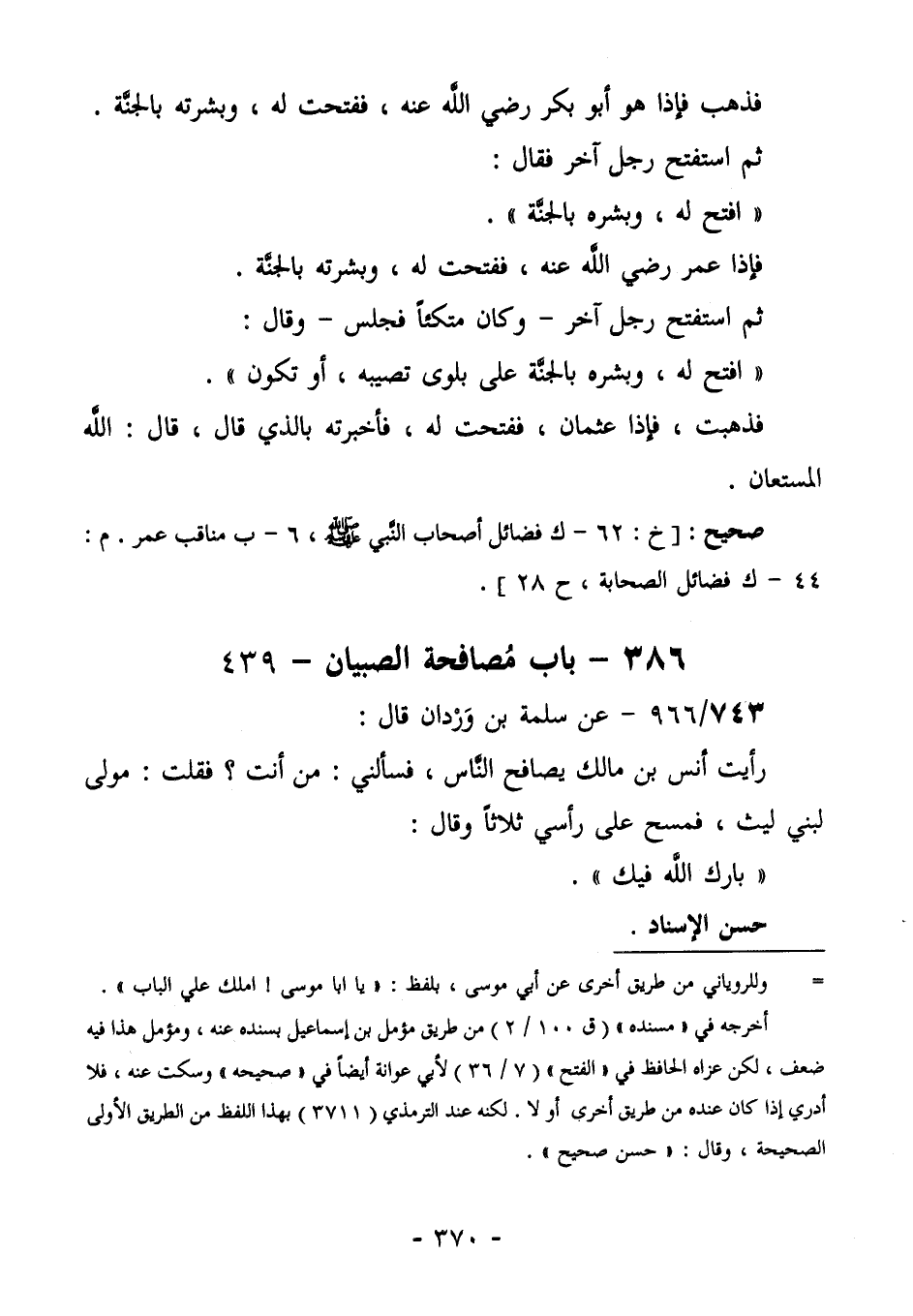 747/966 (صحيح الإسناد) عَنْ سَلَمَةَ بْنِ وَرْدَانَ قَالَ: رَأَيْتُ أَنَسَ بْنَ مَالِكٍ يُصَافِحُ النَّاسَ، فَسَأَلَنِي: مَنْ أَنْتَ؟ فَقُلْتُ: مَوْلًى لِبَنِي لَيْثٍ، فَمَسَحَ عَلَى رَأْسِي ثَلَاثًا، وَقَالَ: "بَارَكَ اللَّهُ فيك".