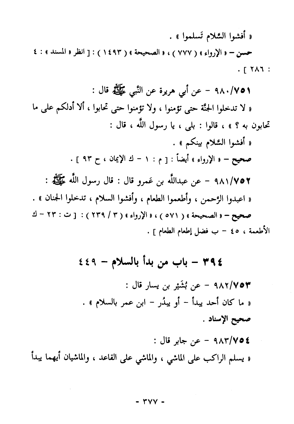 755/980- عَنْ أَبِي هُرَيْرَةَ، عَنِ النَّبِيِّ صَلَّى اللهُ عَلَيْهِ وَسَلَّمَ قَالَ: " لَا تَدْخُلُوا الْجَنَّةَ حَتَّى تُؤْمِنُوا، وَلَا تُؤْمِنُوا حَتَّى تَحَابُّوا، أَلَا أَدُلُّكُمْ عَلَى مَا تَحَابُّونَ بِهِ؟ "، قَالُوا: بَلَى، يَا رَسُولَ اللَّهِ. قال: " أفشوا السلام بينكم".