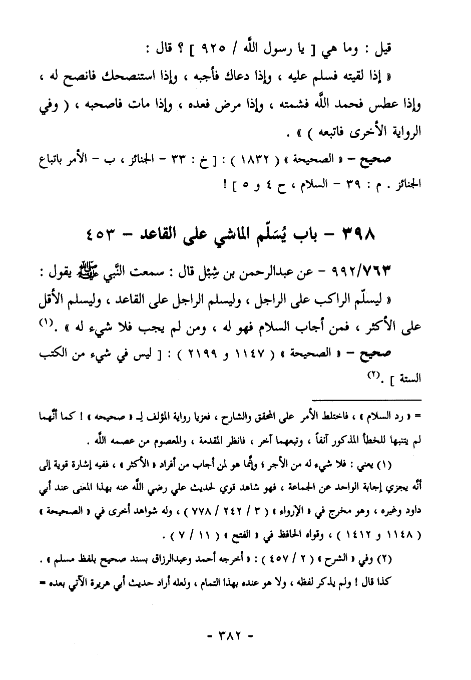 767/992- (صحيح) عَنْ عَبْدِ الرَّحْمَنِ بْنِ شِبْلٍ قَالَ: سَمِعْتُ النَّبِيَّ صَلَّى اللهُ عَلَيْهِ وَسَلَّمَ يَقُولُ: "لِيُسَلِّمِ الرَّاكِبُ عَلَى الرَّاجِلِ، وَلْيُسَلِّمِ الرَّاجِلُ عَلَى الْقَاعِدِ، وَلْيُسَلِّمِ الْأَقَلُّ عَلَى الْأَكْثَرِ، فَمَنْ أَجَابَ السَّلَامَ فَهُوَ لَهُ، وَمَنْ لَمْ يُجِبْ فَلَا شَيْءَ له" (¬1) .