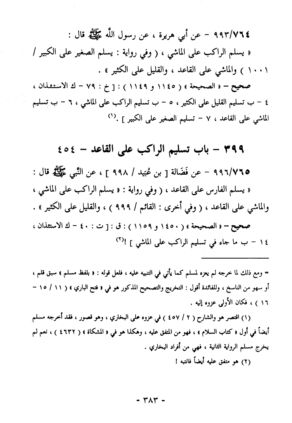 769/996- (صحيح) عَنْ فَضَالَةَ [بْنِ عُبَيْدٍ /998] ، عَنِ النَّبِيَّ صَلَّى اللهُ عَلَيْهِ وَسَلَّمَ قَالَ: " يُسَلِّمُ الْفَارِسُ عَلَى الْقَاعِدِ، (وفي رواية: "يُسَلِّمُ الرَّاكِبُ عَلَى الْمَاشِي، وَالْمَاشِي على القاعد، وفي أخرى: القائم/999) ، والقليل على الكثير".