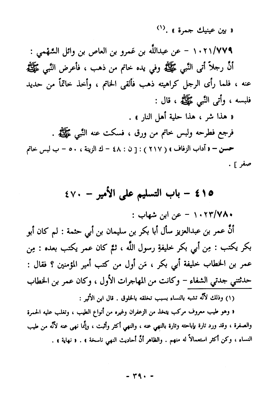 784/1023- (صحيح الإسناد) عَنِ ابْنِ شِهَابٍ: أَنَّ عُمَرَ بْنَ عَبْدِ الْعَزِيزِ سَأَلَ أَبَا بَكْرِ بْنَ سُلَيْمَانَ بْنِ أَبِي حَثْمَةَ: لِمَ كَانَ أَبُو بَكْرٍ يَكْتُبُ: مِنْ أَبِي بَكْرٍ؛ خَلِيفَةِ رَسُولِ اللَّهِ. ثُمَّ كَانَ عُمَرُ يَكْتُبُ بَعْدَهُ: مِنْ عُمَرَ بْنِ الْخَطَّابِ؛ خَلِيفَةِ أَبِي بَكْرٍ. مَنْ أَوَّلُ مَنْ كَتَبَ: أَمِيرَ الْمُؤْمِنِينَ؟ فَقَالَ: حَدَّثَتْنِي جَدَّتِي؛ الشِّفَاءُ- وَكَانَتْ مِنَ الْمُهَاجِرَاتِ الْأُوَلِ، وَكَانَ عُمَرُ بن الخطاب
