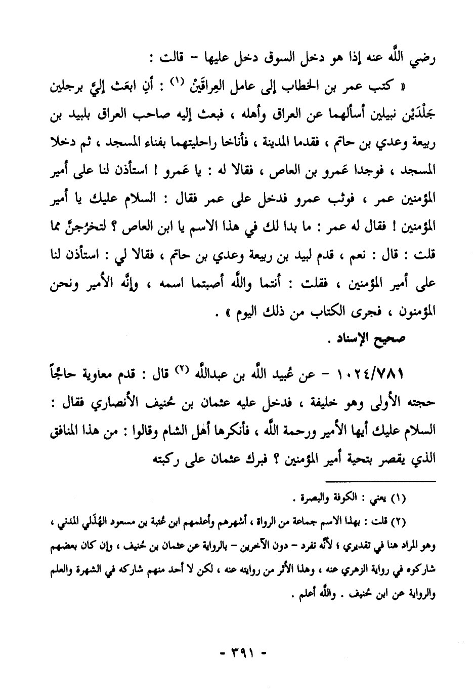 785/1024- (صحيح الإسناد) عَنْ عُبَيْدِ اللَّهِ بْنِ عَبْدِ اللَّهِ (¬2) قَالَ: قَدِمَ مُعَاوِيَةُ حَاجًّا حَجَّتَهُ الْأُولَى وَهُوَ خَلِيفَةٌ فَدَخَلَ عَلَيْهِ عُثْمَانُ بْنُ حُنَيْفٍ الْأَنْصَارِيُّ، فَقَالَ: السَّلَامُ عَلَيْكَ أَيُّهَا الْأَمِيرُ وَرَحْمَةُ اللَّهِ، فَأَنْكَرَهَا أَهْلُ الشَّامِ، وَقَالُوا: مَنْ هَذَا الْمُنَافِقُ الَّذِي يُقَصِّرُ بِتَحِيَّةِ أَمِيرِ الْمُؤْمِنِينَ؟ فَبَرَكَ عثمان على ركبته،