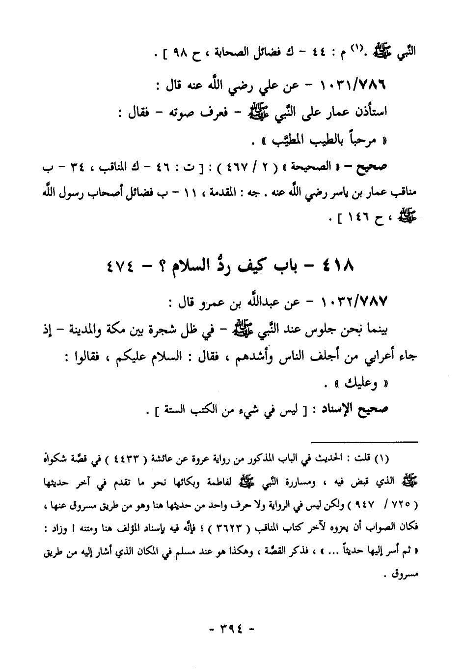 791/1023- (صحيح الإسناد) عَنْ عَبْدِ اللَّهِ بْنِ عَمْرٍو قَالَ: بَيْنَمَا نَحْنُ جُلُوسٌ عِنْدَ النَّبِيَّ صَلَّى اللهُ عَلَيْهِ وَسَلَّمَ فِي ظِلِّ شَجَرَةٍ بَيْنَ مَكَّةَ والمدينة-إذ جاء الأعرابي من أجلف الناس وأشده، فَقَالَ: السَّلَامُ عَلَيْكُمْ. فَقَالُوا: "وَعَلَيْكُمُ