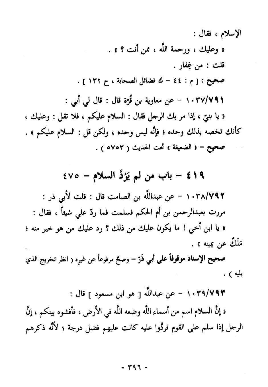 795/1037- (صحيح) عن مُعَاوِيَةَ بْنَ قُرَّةَ قَالَ: قَالَ لِي أَبِي: "يَا بُنَيَّ! إِذَا مَرَّ بِكَ الرَّجُلُ، فَقَالَ: السَّلَامُ عَلَيْكُمْ، فَلَا تَقُلْ: وَعَلَيْكَ. كَأَنَّكَ تَخُصُّهُ بِذَلِكَ وَحْدَهُ؛ فَإِنَّهُ لَيْسَ وَحْدَهُ، وَلَكِنْ قُلِ: السَّلَامُ عَلَيْكُمْ".