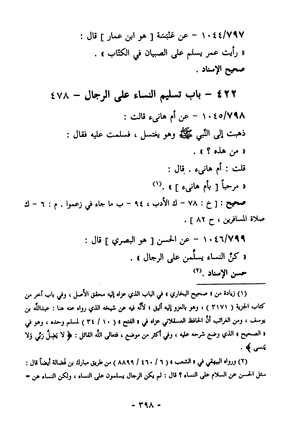 803/1046- (حسن الإسناد) عن الحسن [هو البصري] قال: " كُنَّ النِّسَاءُ يُسَلِّمْنَ عَلَى الرِّجَالِ".