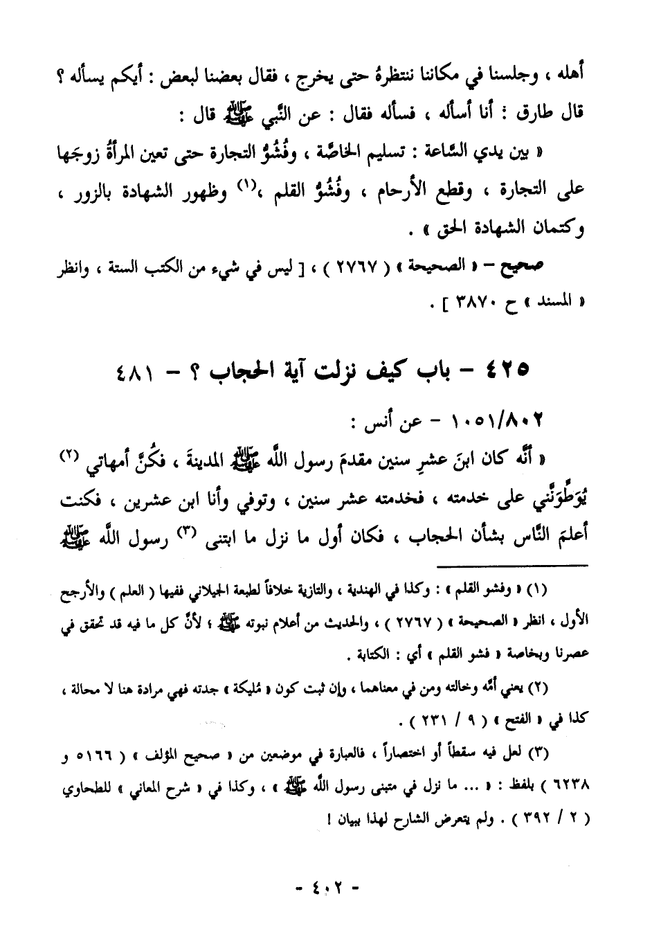 (¬1) "وفشو القلم ": وكذا في الهندية والتازية خلافاً لطبعة الجيلاني ففيها (العلم) والأرجح الأول، انظر "الصحيحة" (2767) ، والحديث من أعلام نبوته صَلَّى اللهُ عَلَيْهِ وَسَلَّمَ؛ لَأَنْ كل ما فيه تحقق في عصرنا وبخاصة "فشو القلم" أي: الكتابة.