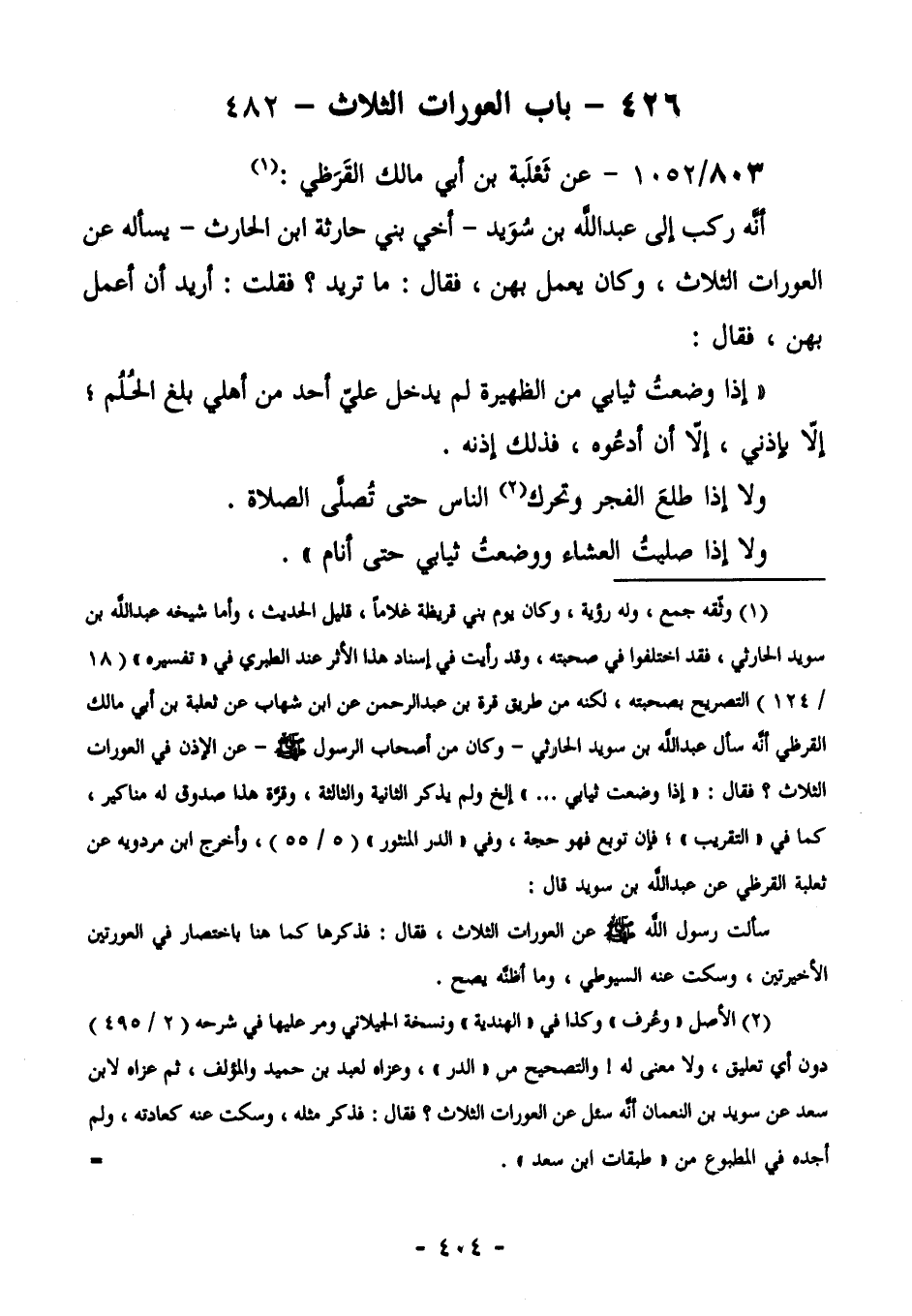 807/1052 (صحيح الإسناد) عَنْ ثَعْلَبَةَ بْنِ أَبِي مَالِكٍ القرظي (¬1) : أنه قال: ركب إلىعبد اللَّهِ بْنِ سُوَيْدٍ - أَخِي بَنِي حَارِثَةَ بْنِ الْحَارِثِ- يَسْأَلُهُ عَنِ الْعَوْرَاتِ الثَّلَاثِ، وَكَانَ يَعْمَلُ بِهِنَّ، فَقَالَ: مَا تُرِيدُ؟ فَقُلْتُ: أُرِيدُ أَنْ أَعْمَلَ بِهِنَّ، فَقَالَ: "إِذَا وَضَعْتُ ثِيَابِي مِنَ الظَّهِيرَةِ، لَمْ يَدْخُلْ عَلَيَّ أَحَدٌ مِنْ أَهْلِي بَلَغَ الْحُلُمَ إِلَّا بِإِذْنِي، إِلَّا أَنْ أَدْعُوَهُ، فَذَلِكَ إِذْنُهُ. وَلَا إِذَا طَلَعَ الْفَجْرُ وَتَحَرَّكَ (¬2)