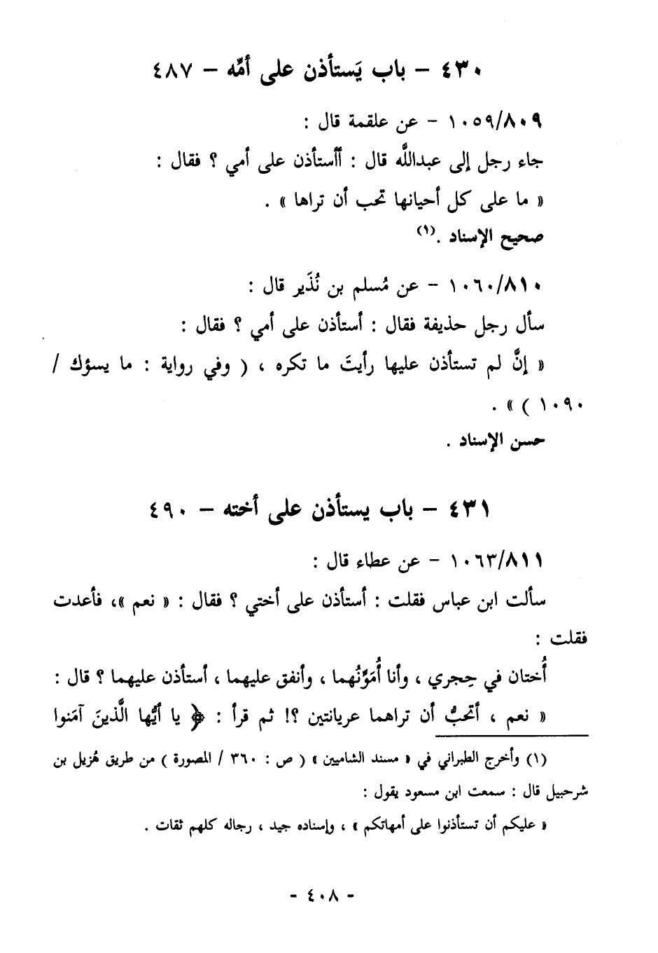 815/1063 (صحيح الإسناد) عَنْ عَطَاءٍ قَالَ: سَأَلْتُ ابْنَ عَبَّاسٍ، فَقُلْتُ: أَسْتَأْذِنُ عَلَى أُخْتِي؟ فَقَالَ: "نَعَمْ". فأعدتُ، فقلتُ: أُخْتَانِ فِي حِجْرِي، وَأَنَا أمونُهُما، وَأُنْفِقُ عَلَيْهِمَا، أَسْتَأْذِنُ عَلَيْهِمَا؟ قَالَ: "نَعَمْ، أَتُحِبُّ أَنْ تَرَاهُمَا عُرْيَانَتَيْنِ؟! ثُمَّ قَرَأَ: {يَا أَيُّهَا الَّذِينَ آمَنُوا