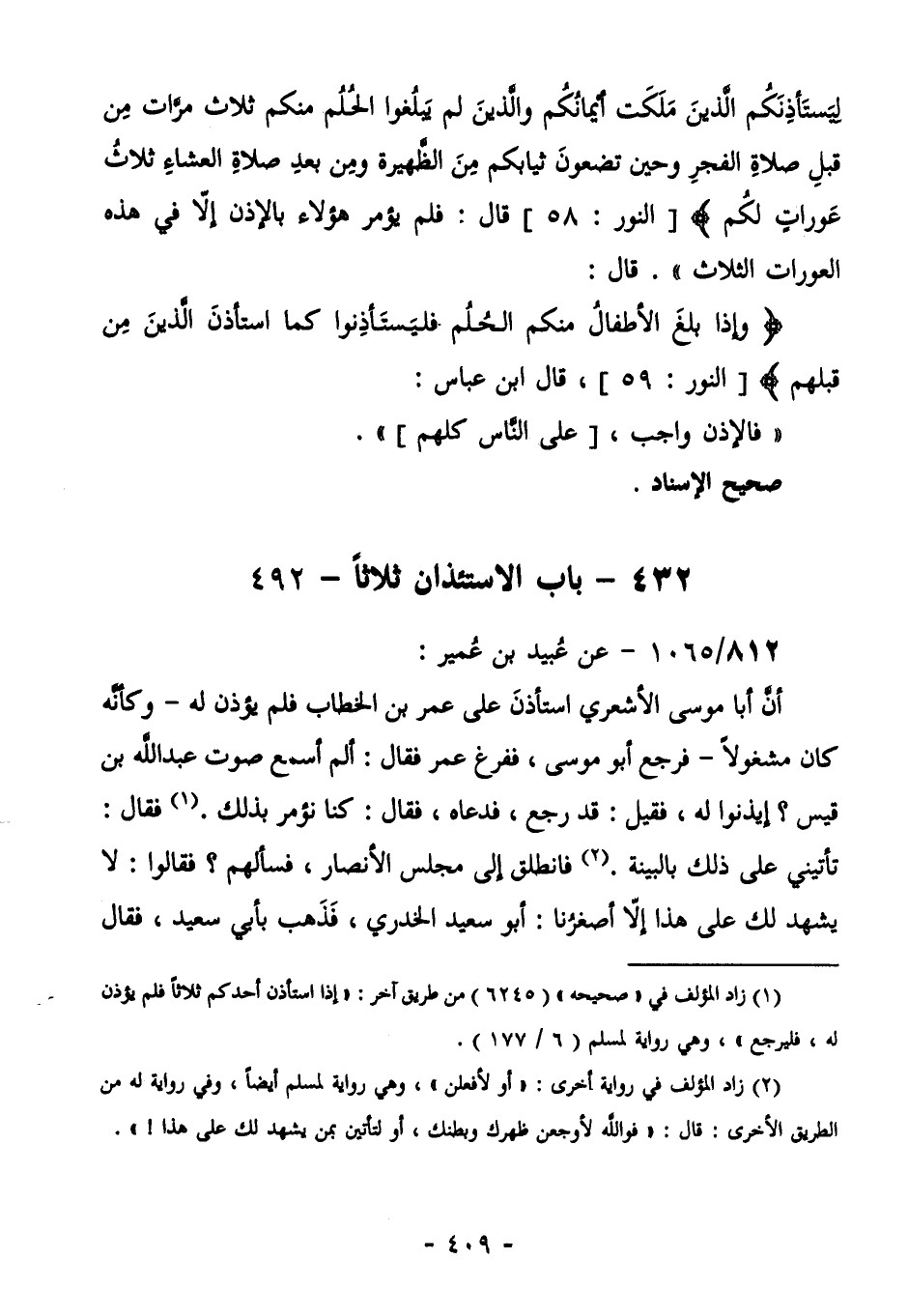 ليستئذنكم الذين ملكت أيمانكم ... } إِلَى: {ثَلَاثُ عَوْرَاتٍ لَكُمْ} [النور: 58] قَالَ: فَلَمْ يُؤْمَرْ هَؤُلَاءِ بِالْإِذْنِ إِلَّا فِي هَذِهِ الْعَوْرَاتِ الثَّلَاثِ". قَالَ: {وَإِذَا بَلَغَ الْأَطْفَالُ مِنْكُمُ الْحُلُمَ} [النور: 59] ، قَالَ ابْنُ عَبَّاسٍ: "فالإذن واجب، [على الناس كلهم] ".
