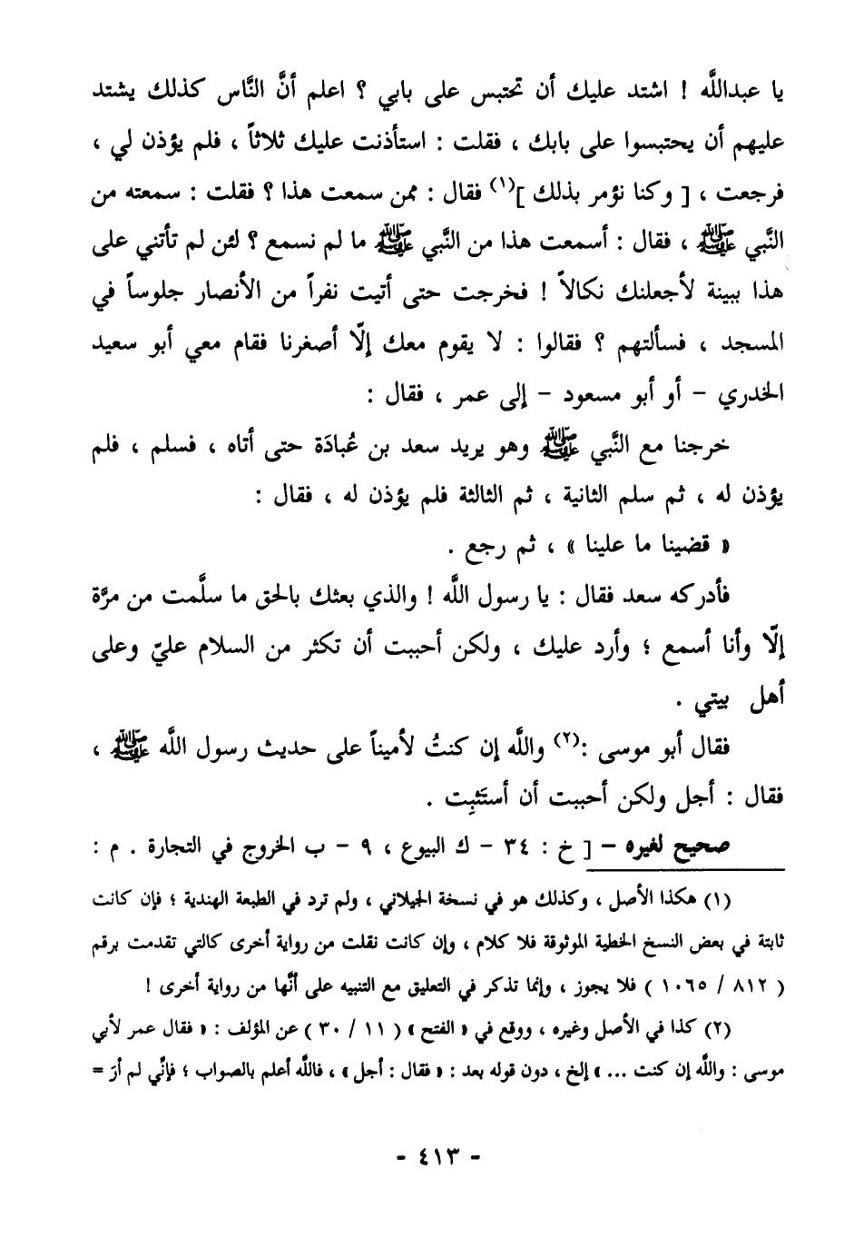 يَا عَبْدَ اللَّهِ! اشْتَدَّ عَلَيْكَ أَنْ تُحْتَبَسَ عَلَى بَابِي؟ اعْلَمْ أَنَّ النَّاسَ كَذَلِكَ يَشْتَدُّ عَلَيْهِمْ أَنْ يُحتبسوا عَلَى بَابِكَ. فَقُلْتُ: بَلِ اسْتَأْذَنْتُ عَلَيْكَ ثَلَاثًا، فَلَمْ يؤذن لي، فرجعت [وكنا نؤمر بذلك] (¬1) . فَقَالَ: مِمَّنْ سَمِعْتَ هَذَا؟ فقلتُ: سَمِعْتُهُ مِنَ النَّبِيِّ صَلَّى اللهُ عَلَيْهِ وَسَلَّمَ. فَقَالَ: أَسَمِعْتَ مِنَ النَّبِيَّ صَلَّى اللهُ عَلَيْهِ وَسَلَّمَ مَا لَمْ نَسْمَعْ؟ لَئِنْ لَمْ تَأْتِنِي عَلَى هَذَا بِبَيِّنَةٍ لَأَجْعَلَنَّكَ نَكَالًا! فَخَرَجْتُ حَتَّى أَتَيْتُ نَفَرًا مِنَ الْأَنْصَارِ جُلُوسًا فِي الْمَسْجِدِ، فسألتهم؟ فقالوا: أو يشك فِي هَذَا أَحَدٌ؟ فَأَخْبَرْتُهُمْ مَا قَالَ عُمَرُ. فَقَالُوا: لَا يَقُومُ مَعَكَ إِلَّا أَصْغَرُنَا، فَقَامَ مَعِي أَبُو سَعِيدٍ الْخُدْرِيُّ- أَوْ أَبُو مَسْعُودٍ- إِلَى عُمَرَ، فَقَالَ: خَرَجْنَا مَعَ النَّبِيِّ صَلَّى اللهُ عَلَيْهِ وَسَلَّمَ وَهُوَ يُرِيدُ سَعْدَ بْنَ عُبَادَةَ حَتَّى أَتَاهُ، فَسَلَّمَ، فَلَمْ يُؤْذَنْ لَهُ، ثُمَّ سَلَّمَ الثَّانِيَةَ، ثُمَّ الثَّالِثَةَ، فَلَمْ يُؤْذَنْ لَهُ، فَقَالَ: "قَضَيْنَا مَا عَلَيْنَا"، ثُمَّ رَجَعَ. فَأَدْرَكَهُ سَعْدٌ، فَقَالَ: يَا رَسُولَ اللَّهِ! وَالَّذِي بَعَثَكَ بِالْحَقِّ مَا سَلَّمْتَ مِنْ مَرَّةٍ إِلَّا وَأَنَا أَسْمَعُ؛ وَأَرُدُّ عَلَيْكَ، وَلَكِنْ أَحْبَبْتُ أَنْ تُكْثِرَ مِنَ السَّلَامِ عَلَيَّ وَعَلَى أَهْلِ بَيْتِي. فَقَالَ (¬2) أَبُو مُوسَى: وَاللَّهِ إِنْ كُنْتُ لَأَمِينًا عَلَى حَدِيثِ رَسُولِ اللَّهِ صَلَّى اللهُ عَلَيْهِ وَسَلَّمَ. فَقَالَ: أَجَلْ، وَلَكِنْ أَحْبَبْتُ أَنْ أَسْتَثْبِتَ.
