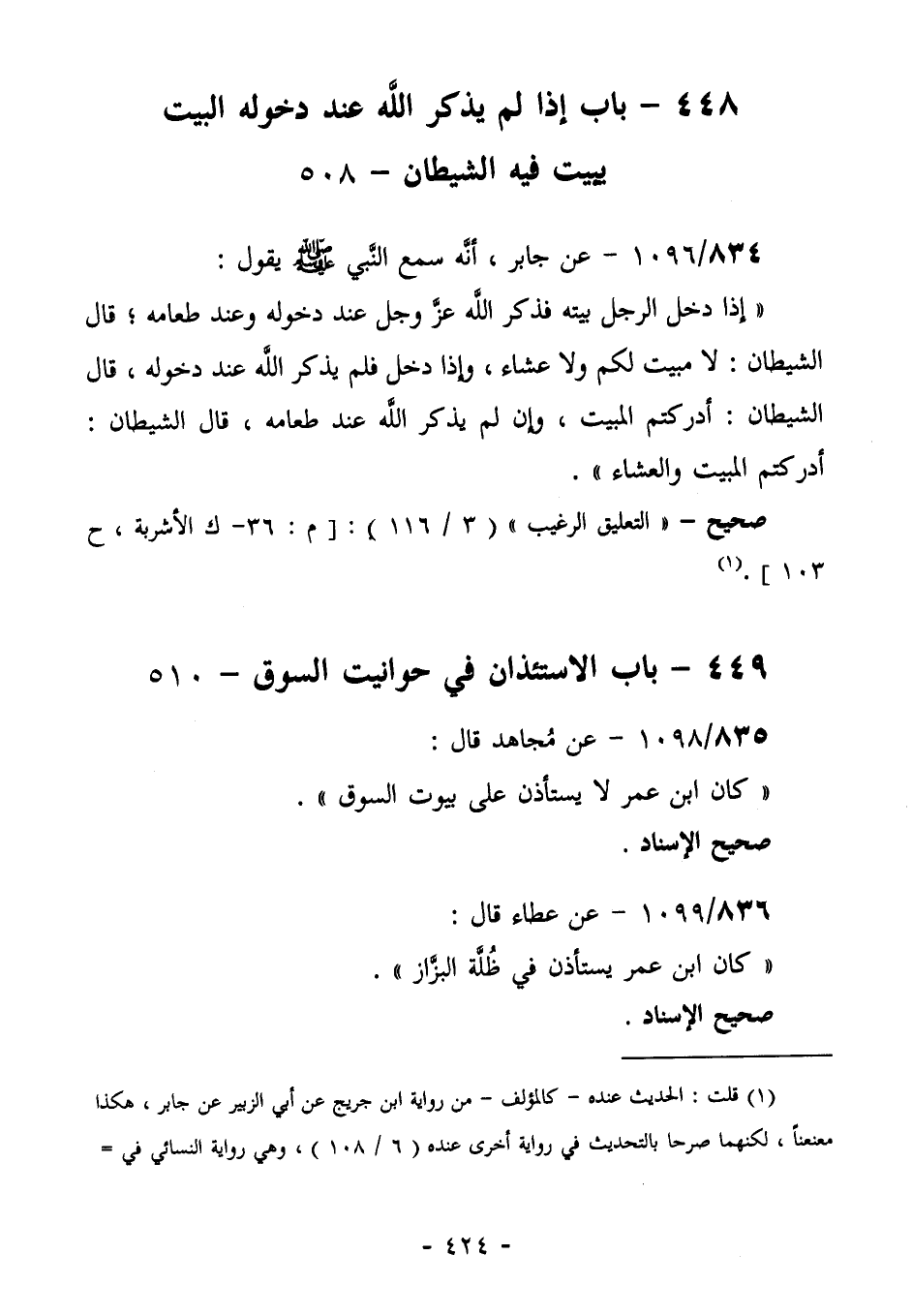 838/1096 (صحيح) عَنْ جَابِرٍ؛ أَنَّهُ سَمِعَ النَّبِيَّ صَلَّى اللهُ عَلَيْهِ وَسَلَّمَ يَقُولُ: "إِذَا دَخَلَ الرَّجُلُ بَيْتَهُ، فَذَكَرَ اللَّهَ عَزَّ وَجَلَّ عِنْدَ دُخُولِهِ، وَعِنْدَ طَعَامِهِ. قَالَ الشَّيْطَانُ: لَا مَبِيتَ لَكُمْ وَلَا عَشَاءَ، وَإِذَا دَخَلَ، فَلَمْ يَذْكُرِ اللَّهَ عِنْدَ دُخُولِهِ. قَالَ الشَّيْطَانُ: أَدْرَكْتُمُ الْمَبِيتَ، وَإِنْ لَمْ يَذْكُرِ اللَّهَ عِنْدَ طَعَامِهِ. قَالَ الشَّيْطَانُ: أَدْرَكْتُمُ الْمَبِيتَ والعشاء".