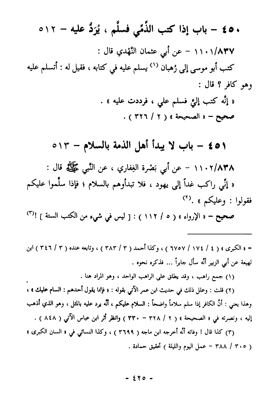 (¬2) قلت: وعلل في حديث ابن عمر الآتي بقوله: " فإنما يقول أحدهم: السام عليك"، وهذا يعني: أن الكافر إذا سلم سلاماً واضحاً: السلام عليكم، أنه يرد عليه بالمثل، وهو الذي أذهب إليه، ونصرته في "الصحيحة" (2/328-330) وانظر أثر ابن عباس الآتي (852/1113) .