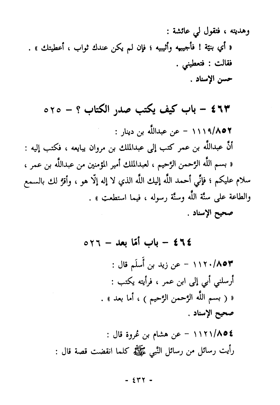 857/1120 (صحيح الإسناد) عَنْ زَيْدِ بْنِ أَسْلَمَ قَالَ: أَرْسَلَنِي أَبِي إِلَى ابْنِ عُمَرَ، فَرَأَيْتُهُ يَكْتُبُ: "بِسْمِ اللَّهِ الرَّحْمَنِ الرحيم، أما بعد: ".
