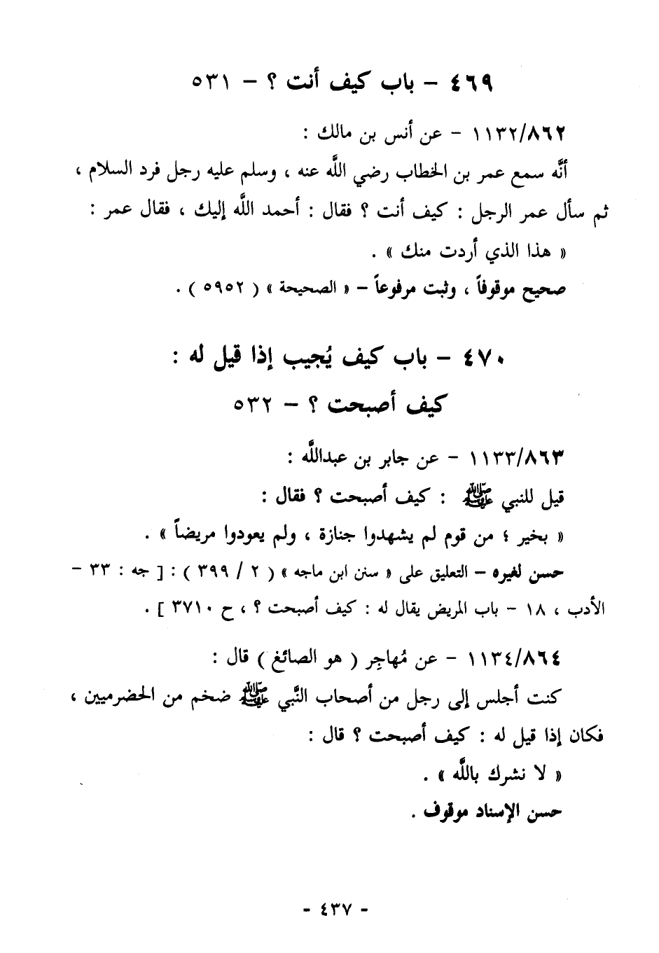 866/1132 (صحيح موقوفاً، وثبت مرفوعاً) عَنْ أَنَسِ بْنِ مَالِكٍ: أَنَّهُ سَمِعَ عُمَرَ بْنَ الْخَطَّابِ رَضِيَ اللَّهُ عَنْهُ، وَسَلَّمَ عَلَيْهِ رَجُلٌ فَرَدَّ السَّلَامَ، ثُمَّ سَأَلَ عُمَرُ الرَّجُلَ: كَيْفَ أَنْتَ؟ فَقَالَ: أَحْمَدُ اللَّهَ إِلَيْكَ، فَقَالَ عُمَرُ: "هَذَا الَّذِي أَرَدْتُ مِنْكَ".