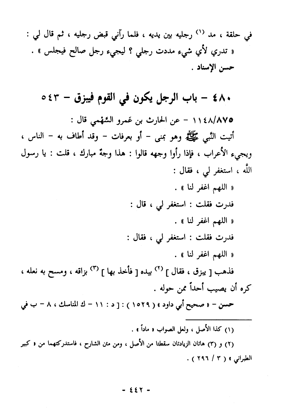 879/1148 (حسن) عن الحارث بن عمرو السهمي قَالَ: أَتَيْتُ النَّبِيَّ صَلَّى اللهُ عَلَيْهِ وَسَلَّمَ وَهُوَ بِمِنًى - أَوْ بِعَرَفَاتٍ- وَقَدْ أَطَافَ بِهِ النَّاسُ، وَيَجِيءُ الْأَعْرَابُ، فَإِذَا رَأَوْا وَجْهَهُ، قَالُوا: هَذَا وَجْهٌ مُبَارَكٌ، قُلْتُ: يَا رَسُولَ اللَّهِ! اسْتَغْفِرْ لِي، فَقَالَ: " اللَّهُمَّ اغْفِرْ لَنَا". فدرتُ، فَقُلْتُ: اسْتَغْفِرْ لِي، قَالَ: "اللَّهُمَّ اغْفِرْ لَنَا". فَدُرْتُ، فَقُلْتُ: اسْتَغْفِرْ لِي، فَقَالَ: "اللَّهُمَّ اغْفِرْ لَنَا". فَذَهَبَ [يَبْزُقُ، فَقَالَ] ) (¬2) بِيَدِهِ [فَأَخَذَ بها] (1) بزاقه، ومسح بها نَعْلَهُ، كَرِهَ أَنْ يُصِيبَ أَحَدًا من حوله.