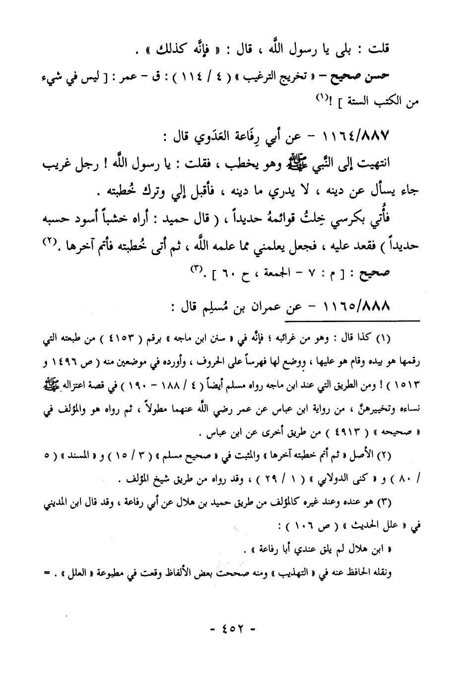 891/1164 (صحيح) عَنْ أَبِي رِفَاعَةَ الْعَدَوِيِّ قَالَ: انْتَهَيْتُ إِلَى النَّبِيِّ صَلَّى اللهُ عَلَيْهِ وَسَلَّمَ وَهُوَ يَخْطُبُ، فَقُلْتُ: يَا رَسُولَ اللَّهِ! رَجُلٌ غَرِيبٌ جَاءَ يَسْأَلُ عَنْ دِينِهِ، لَا يَدْرِي مَا دِينُهُ؟ فَأَقْبَلَ إِلَيَّ وَتَرَكَ خُطْبَتَهُ. فَأَتَى بِكُرْسِيٍّ خِلْتُ قَوَائِمَهُ حَدِيدًا، - قَالَ حُمَيْدٌ: أُرَاهُ خَشَبًا أَسْوَدَ حَسَبُهُ حَدِيدًا- فَقَعَدَ عليه، فجعل يعلمني مما عمله اللَّهُ، ثُمَّ أَتَمَّ خُطْبَتَهُ؛ آخِرَهَا (¬1) .