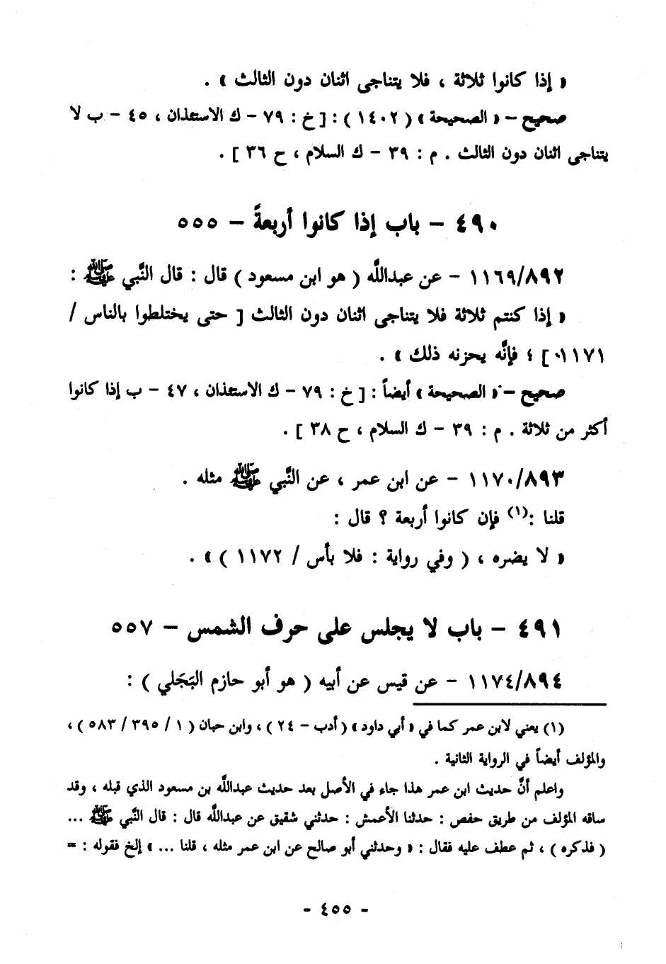 896/1169 (صحيح) عن عبد الله [هو ابن مَسْعُودٍ] قَالَ: قَالَ النَّبِيُّ صَلَّى اللهُ عَلَيْهِ وَسَلَّمَ: " إِذَا كُنْتُمْ ثَلَاثَةً فَلَا يَتَنَاجَى اثْنَانِ دُونَ الثالث [حتى يختلطوا بالناس/1171] ؛ فإنه يحزنه ذلك".