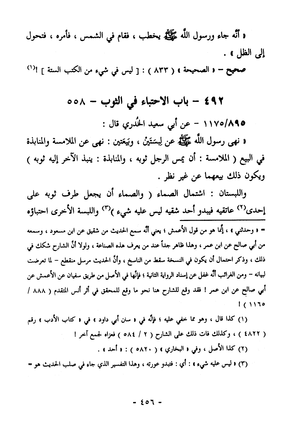 899/1175 (صحيح) عَنْ أَبِي سَعِيدٍ الْخُدْرِيِّ قَالَ: "نَهَى رَسُولُ اللَّهِ صَلَّى اللهُ عَلَيْهِ وَسَلَّمَ عَنْ لِبْسَتَيْنِ، وَبَيْعَتَيْنِ: نَهَى عَنِ الْمُلَامَسَةِ وَالْمُنَابَذَةِ: فِي البيع - الملامسة: يَمَسَّ الرَّجُلُ ثَوْبَهُ. وَالْمُنَابَذَةُ: يَنْبُذُ الْآخَرُ إِلَيْهِ ثَوْبَهُ- وَيَكُونُ ذَلِكَ بيعهما عَنْ غَيْرِ نَظَرٍ. وَاللِّبْسَتَيْنِ اشْتِمَالُ الصَّمَّاءِ- وَالصَّمَّاءُ: أَنْ يَجْعَلَ طَرَفَ ثَوْبِهِ عَلَى إِحْدَى (¬1) عَاتِقَيْهِ، فَيَبْدُو أَحَدُ شِقَّيْهِ لَيْسَ عَلَيْهِ شَيْءٌ (¬2) - واللبسة الأخرى احتباؤه