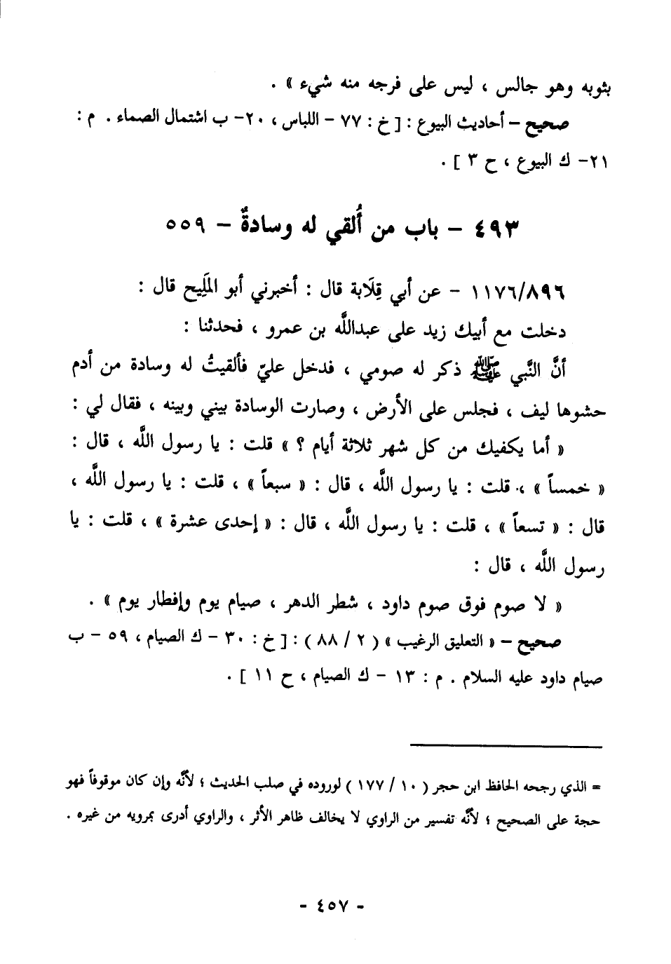 900/1176 (صحيح) عَنْ أَبِي قِلَابَةَ قَالَ: أَخْبَرَنِي أَبُو الْمَلِيحِ قَالَ: دَخَلْتُ مَعَ أَبِيكَ؛ زَيْدٍ عَلَى عَبْدِ اللَّهِ بْنِ عَمْرٍو، فَحَدَّثَنَا: أَنَّ النَّبِيَّ صَلَّى اللهُ عَلَيْهِ وَسَلَّمَ ذُكر له صومي، فدخل عليه، فَأَلْقَيْتُ لَهُ وِسَادَةً مِنْ أَدَمٍ حَشْوُهَا لِيفٌ، فَجَلَسَ عَلَى الْأَرْضِ، وَصَارَتِ الْوِسَادَةُ بَيْنِي وَبَيْنَهُ، فَقَالَ لِي: "أَمَا يَكْفِيكَ مِنْ كُلِّ شَهْرٍ ثَلَاثَةُ أَيَّامٍ؟ ". [قَالَ: قُلْتُ: يَا رَسُولَ اللَّهِ!] قَالَ: "خَمْسًا". قُلْتُ: يَا رَسُولَ اللَّهِ! [قُلْتُ: يَا رَسُولَ اللَّهِ! قَالَ: "سَبْعًا" قُلْتُ: يَا رَسُولَ اللَّهِ! قَالَ: "تِسْعًا"، قُلْتُ: يَا رَسُولَ اللَّهِ!] قَالَ: "إِحْدَى عَشْرَةَ". قُلْتُ: يَا رَسُولَ اللَّهِ! قَالَ: "لَا صَوْمَ فَوْقَ صَوْمِ دَاوُدَ؛ شَطْرَ الدَّهْرِ، صيام يومٍ وإفطار يوم".