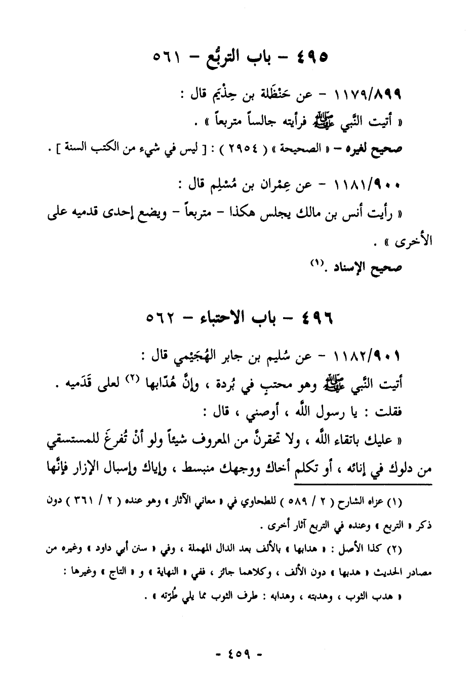 904/1181 (صحيح الإسناد) عَنْ عِمْرَانَ بْنِ مُسْلِمٍ قَالَ: "رَأَيْتُ أَنَسَ بْنَ مَالِكٍ يَجْلِسُ هَكَذَا - مُتَرَبِّعًا- وَيَضَعُ إِحْدَى قَدَمَيْهِ على الأخرى"..