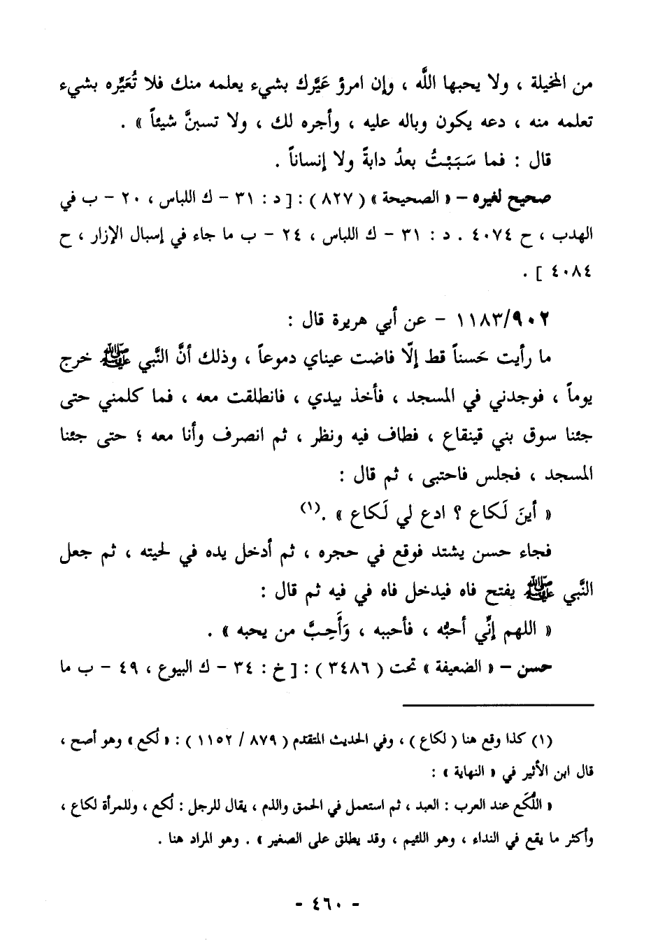 906/1183 (حسن) عَنْ أَبِي هُرَيْرَةَ قَالَ: مَا رَأَيْتُ حَسَنًا قَطُّ إِلَّا فَاضَتْ عَيْنَايَ دُمُوعًا؛ وَذَلِكَ أَنَّ النَّبِيَّ صَلَّى اللهُ عَلَيْهِ وَسَلَّمَ خَرَجَ يَوْمًا، فَوَجَدَنِي فِي الْمَسْجِدِ، فَأَخَذَ بِيَدِي، فَانْطَلَقْتُ مَعَهُ، فَمَا كَلَّمَنِي حَتَّى جِئْنَا سُوقَ بَنِي قَيْنُقَاعٍ، فَطَافَ فِيهِ وَنَظَرَ، ثُمَّ انْصَرَفَ وَأَنَا مَعَهُ؛ حَتَّى جِئْنَا الْمَسْجِدَ، فَجَلَسَ فَاحْتَبَى، ثُمَّ قَالَ: "أَيْنَ لكاع؟ ادع لي لكاع" (¬1) . فَجَاءَ حَسَنٌ يَشْتَدُّ فَوَقَعَ فِي حِجْرِهِ، ثُمَّ أَدْخَلَ يَدَهُ فِي لِحْيَتِهِ، ثُمَّ جَعَلَ النَّبِيُّ صَلَّى اللهُ عَلَيْهِ وَسَلَّمَ يَفْتَحُ فَاهُ فَيُدْخِلُ فَاهُ فِي فِيهِ، ثُمَّ قَالَ: " اللَّهُمَّ إِنِّي أُحِبُّهُ، فَأَحْبِبْهُ، وأحب من يحبه".