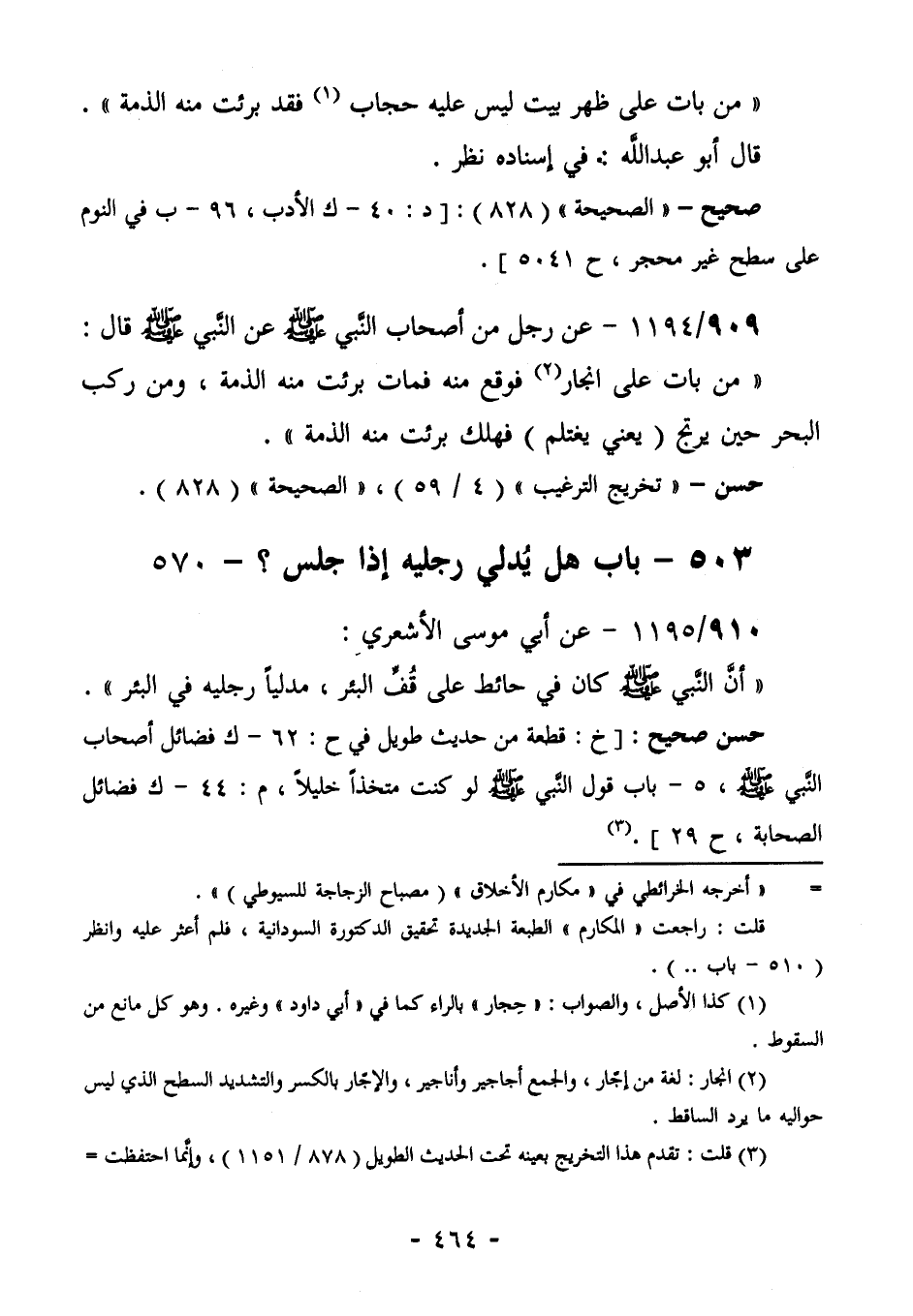914/1195 (حسن صحيح) عَنْ أَبِي مُوسَى الْأَشْعَرِيِّ: " أَنَّ النَّبِيَّ صَلَّى اللهُ عَلَيْهِ وَسَلَّمَ كَانَ فِي حَائِطٍ عَلَى قُفِّ الْبِئْرِ، مُدَلِّيًا رِجْلَيْهِ فِي الْبِئْرِ".
