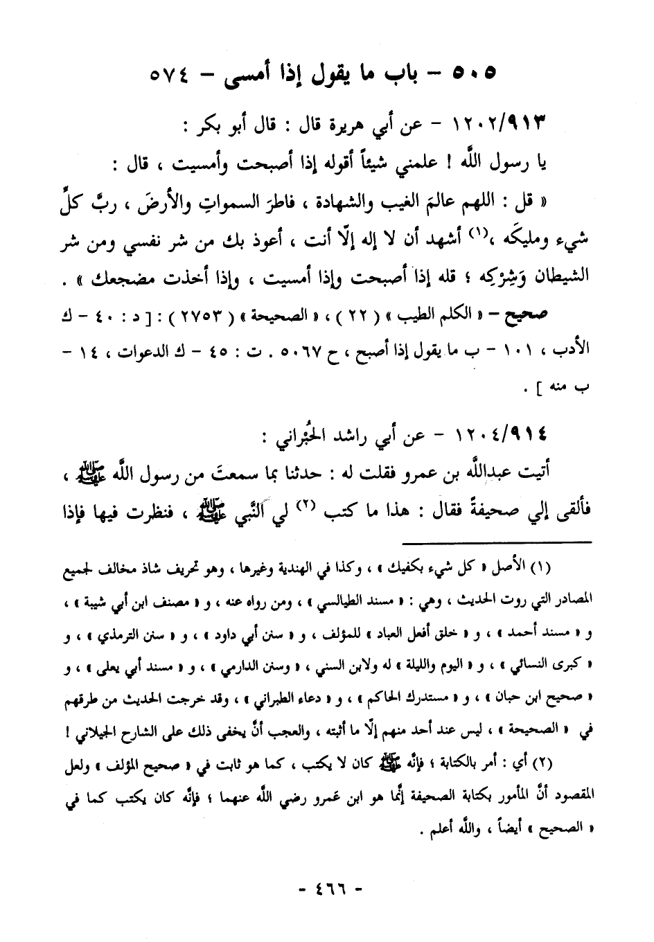 917/1202 (صحيح) عَنْ أَبِي هُرَيْرَةَ قَالَ: قَالَ أَبُو بَكْرٍ: يَا رَسُولَ اللَّهِ! عَلِّمْنِي شَيْئًا أَقُولُهُ إِذَا أَصْبَحْتُ وَأَمْسَيْتُ، قَالَ: "قُلِ: اللَّهُمَّ عَالِمَ الْغَيْبِ وَالشَّهَادَةِ، فَاطِرَ السَّمَاوَاتِ وَالْأَرْضِ، رَبَّ كُلِّ شَيْءٍ وَمَلِيكَهُ (¬1) أَشْهَدُ أَنْ لَا إِلَهَ إِلَّا أَنْتَ، أَعُوذُ بِكَ مِنْ شَرِّ نَفْسِي، وَمِنْ شَرِّ الشَّيْطَانِ وَشِرْكِهِ؛ قلُهُ إِذَا أَصْبَحْتَ وَإِذَا أَمْسَيْتَ، وَإِذَا أخذت مضجعك".