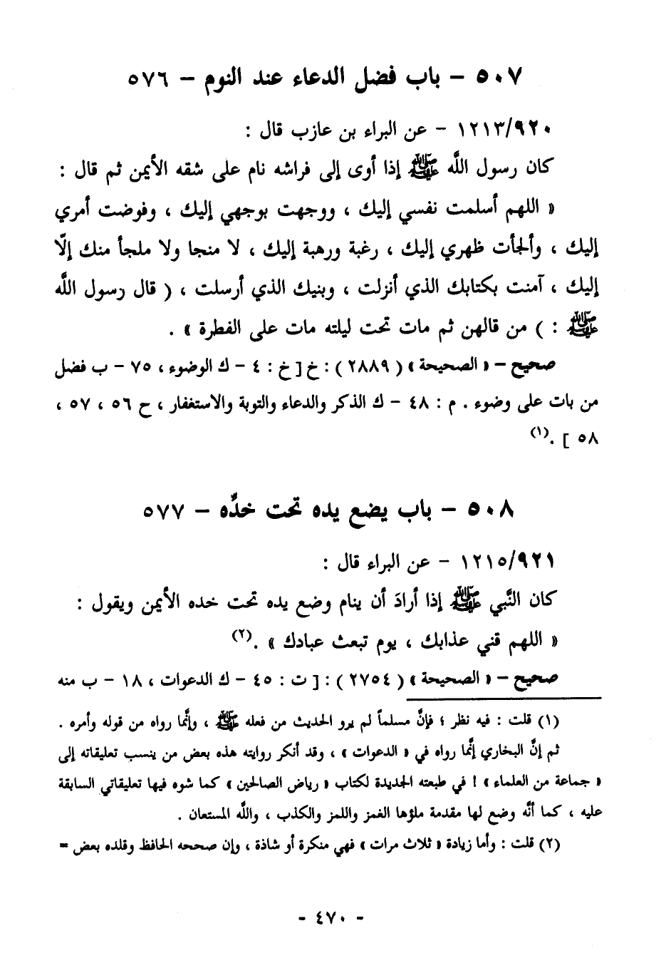 924/1213 (صحيح) عَنِ الْبَرَاءِ بْنِ عَازِبٍ قَالَ: كَانَ رَسُولُ اللَّهِ صَلَّى اللهُ عَلَيْهِ وَسَلَّمَ إِذَا أَوَى إِلَى فِرَاشِهِ نَامَ عَلَى شِقِّهِ الْأَيْمَنِ، ثُمَّ قَالَ: " اللَّهُمَّ أَسْلَمْتُ نَفْسِي إِلَيْكَ، وَوَجَّهْتُ بِوَجْهِي إِلَيْكَ، وَفَوَّضْتُ أَمْرِي إِلَيْكَ، وَأَلْجَأْتُ ظَهْرِي إِلَيْكَ؛ رَغْبَةً وَرَهْبَةً إِلَيْكَ، لَا مَنْجَا وَلَا مَلْجَأَ مِنْكَ إِلَّا إِلَيْكَ، آمَنْتُ بِكِتَابِكَ الَّذِي أَنْزَلْتَ، وَنَبِيِّكَ الَّذِي أَرْسَلْتَ". قَالَ رَسُولُ اللَّهِ صَلَّى اللهُ عَلَيْهِ وَسَلَّمَ: "مَنْ قَالَهُنَّ ثُمَّ مَاتَ تَحْتَ لَيْلَتِهِ مات على الفطرة".