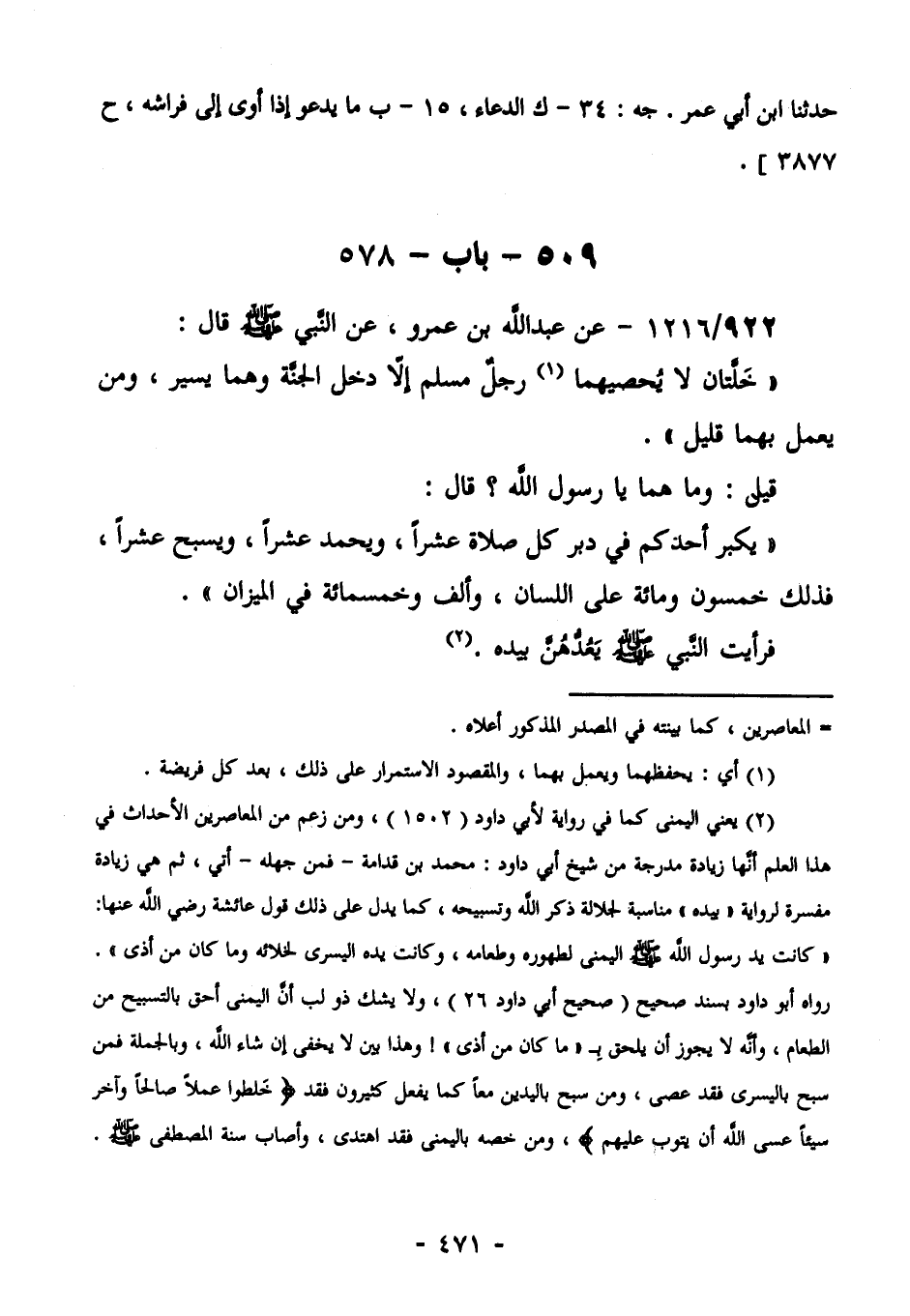 926/1216 (صحيح) عَنْ عَبْدِ اللَّهِ بْنِ عَمْرٍو، عَنِ النَّبِيِّ صَلَّى اللهُ عَلَيْهِ وَسَلَّمَ قَالَ: " خَلَّتَانِ لَا يُحْصِيهِمَا (¬1) رَجُلٌ مُسْلِمٌ إِلَّا دَخَلَ الْجَنَّةَ، وَهُمَا يسيرٌ، وَمَنْ يَعْمَلُ بِهِمَا قَلِيلٌ". قِيلَ وَمَا هُمَا يَا رَسُولَ اللَّهِ؟ قَالَ: " يُكَبِّرُ أَحَدُكُمْ فِي دُبُرِ كُلِّ صَلَاةٍ عَشْرًا وَيَحْمَدُ عَشْرًا، وَيُسَبِّحُ عَشْرًا، فَذَلِكَ خَمْسُونَ وَمِائَةٌ عَلَى اللِّسَانِ، وَأَلْفٌ خمسمائة فِي الْمِيزَانِ". فَرَأَيْتُ النَّبِيَّ صَلَّى اللهُ عَلَيْهِ وَسَلَّمَ يَعُدُّهُنَّ بِيَدِهِ (¬2) .