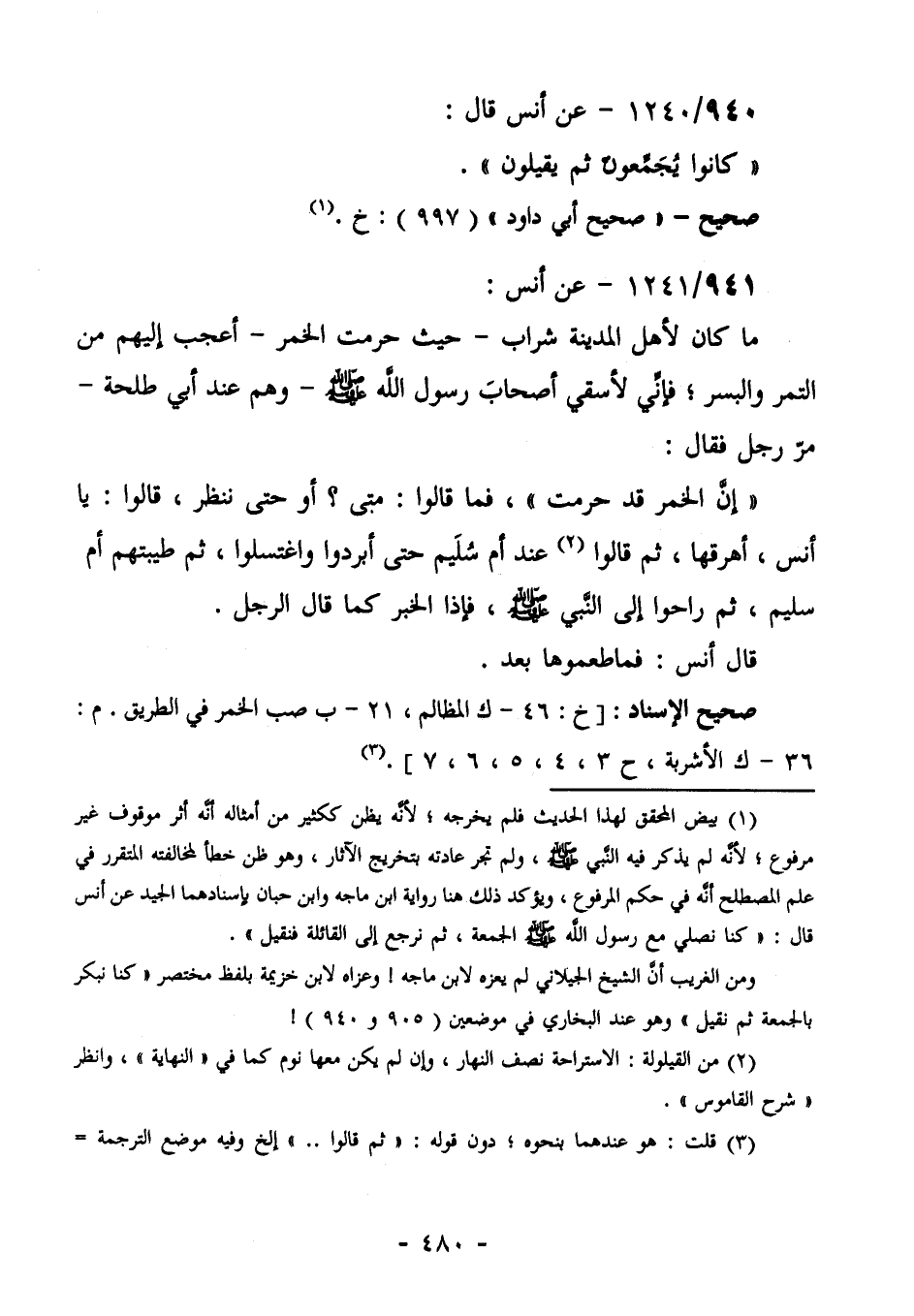 946/1241 (صحيح الإسناد) عن أَنَسٌ: مَا كَانَ لِأَهْلِ الْمَدِينَةِ شَرَابٌ - حَيْثُ حُرِّمَتِ الْخَمْرُ - أَعْجَبَ إِلَيْهِمْ مِنَ التَّمْرِ والبُسر؛ فَإِنِّي لَأَسْقِي أَصْحَابَ رَسُولِ اللَّهِ صَلَّى اللهُ عَلَيْهِ وَسَلَّمَ - وَهُمْ عِنْدَ أَبِي طَلْحَةَ- مَرَّ رجلٌ فَقَالَ: " إِنَّ الْخَمْرَ قَدْ حُرِّمَتْ". فَمَا قَالُوا: مَتَى؟ أَوْ حَتَّى نَنْظر. قَالُوا: يَا أَنَسُ! أَهْرِقْهَا، ثُمَّ قالوا (¬1) عند أم سليم أَبْرَدُوا وَاغْتَسَلُوا، ثُمَّ طَيَّبَتْهُمْ أُمُّ سُلَيْمٍ، ثُمَّ رَاحُوا إِلَى النَّبِيِّ صَلَّى اللهُ عَلَيْهِ وَسَلَّمَ، فَإِذَا الْخَبَرُ كَمَا قَالَ الرَّجُلُ. قَالَ أنس: فما طعموها بعد.