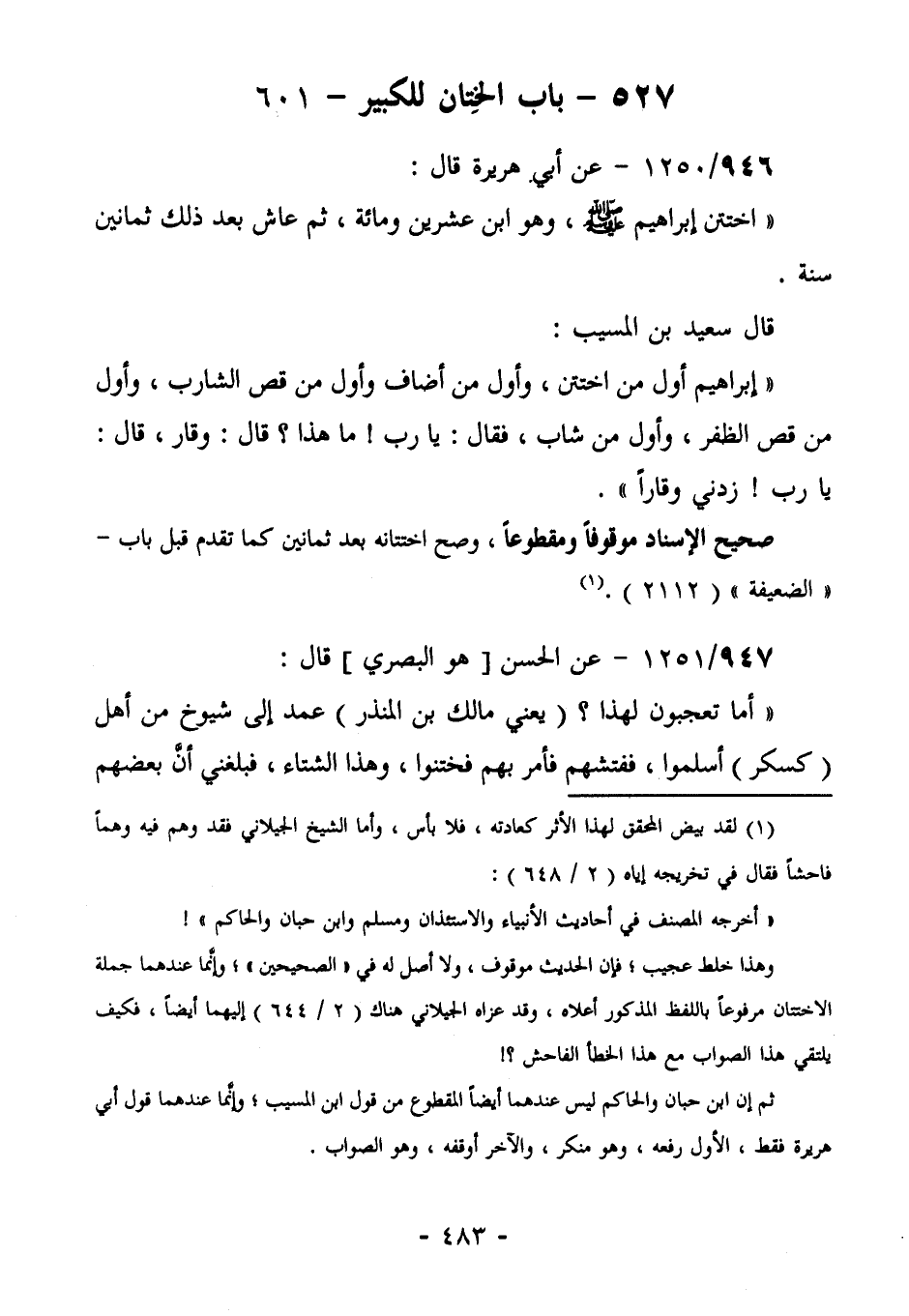 951/1250 (صحيح الإسناد موقوفاً ومقطوعاً، وصحّ عنه مرفوعاً) عَنْ أَبِي هُرَيْرَةَ قَالَ: " اخْتَتَنَ إِبْرَاهِيمُ صَلَّى اللهُ عَلَيْهِ وَسَلَّمَ، وَهُوَ ابْنُ عِشْرِينَ وَمِائَةٍ، ثُمَّ عاش بعد ذلك ثمانين سنة. قال سعيد [بن المسيب] : "إِبْرَاهِيمُ أَوَّلُ مَنِ اخْتَتَنَ، وَأَوَّلُ مَنْ أَضَافَ، وَأَوَّلُ مَنْ قَصَّ الشَّارِبَ، وَأَوَّلُ مَنْ قَصَّ الظُّفُرَ، أول مَنْ شابَ، فَقَالَ: يَا رَبِّ! مَا هَذَا؟ قَالَ: وَقَارٌ، قَالَ: يا رب زدني وقاراً".