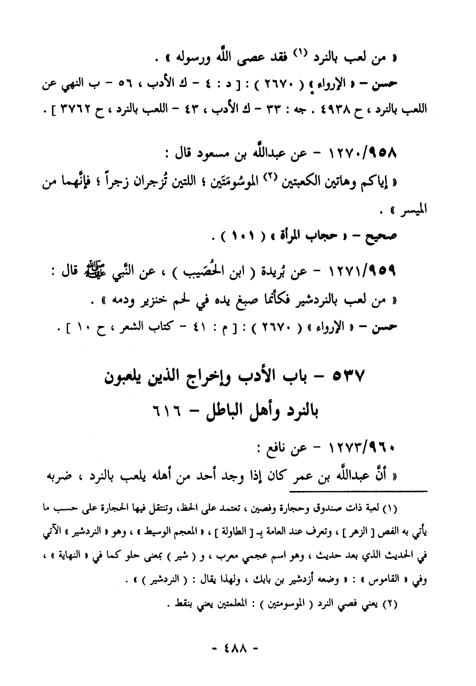 965/1273 (صحيح الإسناد موقوفاً) عَنْ نَافِعٍ: " أَنَّ عَبْدَ اللَّهِ بْنَ عُمَرَ كَانَ إِذَا وَجَدَ أَحَدًا مِنْ أَهْلِهِ يَلْعَبُ بِالنَّرْدِ ضربه،