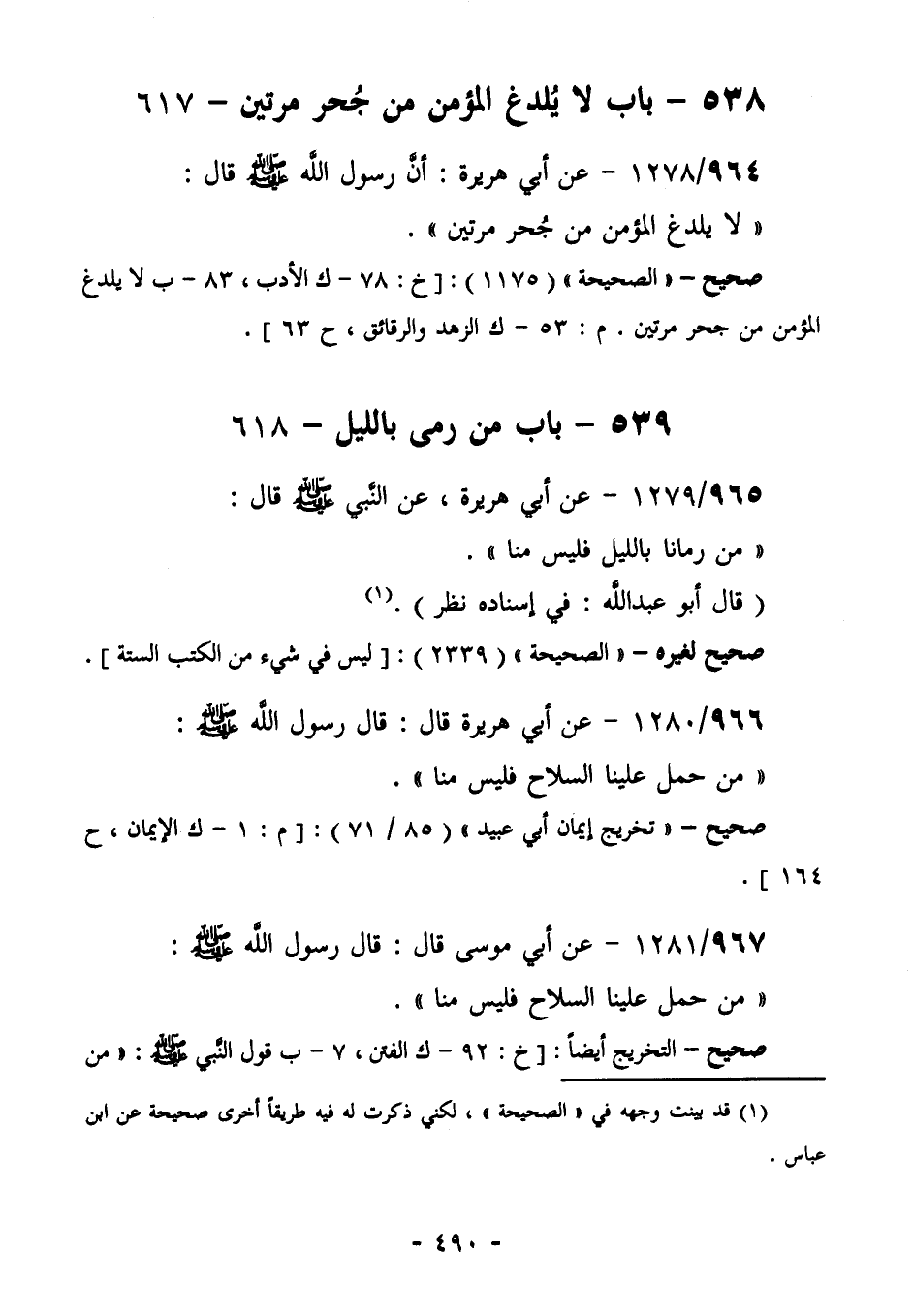 971/1280 (صحيح) عَنْ أَبِي هُرَيْرَةَ قَالَ: قَالَ رَسُولَ اللَّهِ صَلَّى اللهُ عَلَيْهِ وَسَلَّمَ: " مَنْ حَمَلَ عَلَيْنَا السِّلَاحَ فليس منا".