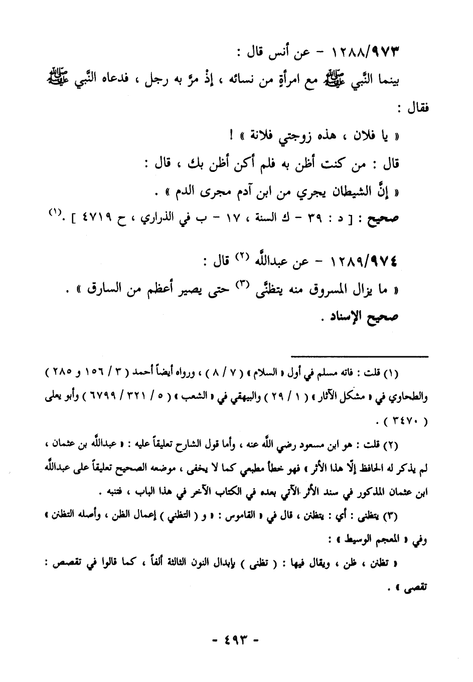978/1288 (صحيح) عَنْ أَنَسٍ قَالَ: بَيْنَمَا النَّبِيُّ صَلَّى اللهُ عَلَيْهِ وَسَلَّمَ مَعَ امْرَأَةٍ مِنْ نِسَائِهِ، إِذْ مَرَّ بِهِ رَجُلٌ، فَدَعَاهُ النَّبِيُّ صَلَّى اللهُ عَلَيْهِ وَسَلَّمَ فَقَالَ: "يَا فُلَانُ [إِنَّ] هَذِهِ زَوْجَتِي فُلَانَةٌ"! قَالَ: مَنْ كُنْتُ أَظُنُّ بِهِ فَلَمْ أَكُنْ أَظُنُّ بِكَ، قَالَ: " إِنَّ الشَّيْطَانَ يَجْرِي مِنِ ابْنِ آدم مجرى الدم".