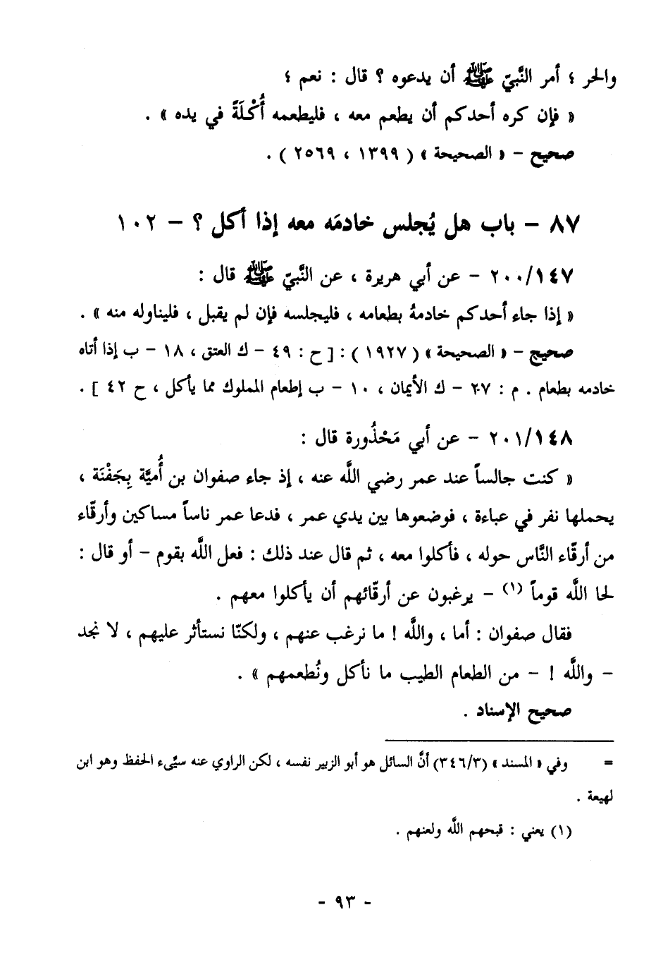 148/201 (صحيح الإسناد) - عن أبي محذورة قال: " كُنْتُ جَالِسًا عِنْدَ عُمَرَ رَضِيَ اللَّهُ عَنْهُ إِذْ جَاءَ صَفْوَانُ بْنُ أُمَيَّةَ بِجَفْنَةٍ، يَحْمِلُهَا نفرٌ فِي عباءةٍ، فَوَضَعُوهَا بَيْنَ يَدَيْ عُمَرَ، فَدَعَا عُمَرُ نَاسًا مَسَاكِينَ وَأَرِقَّاءَ مِنْ أَرِقَّاءِ النَّاسِ حَوْلَهُ، فَأَكَلُوا مَعَهُ، ثُمَّ قَالَ: عِنْدَ ذَلِكَ: فَعَلَ اللَّهُ بِقَوْمٍ- أَوْ قَالَ: لَحَا اللَّهُ قَوْمًا (¬1) - يَرْغَبُونَ عَنْ أَرِقَّائِهِمْ أَنْ يَأْكُلُوا مَعَهُمْ فَقَالَ صَفْوَانُ أَمَا وَاللَّهِ! مَا نرغب عنهم ولكنا نَسْتَأْثِرُ عَلَيْهِمْ، لَا نَجْدُ - وَاللَّهِ! - مِنَ الطَّعَامِ الطِّيبِ مَا نَأْكُلُ ونطعمهم".