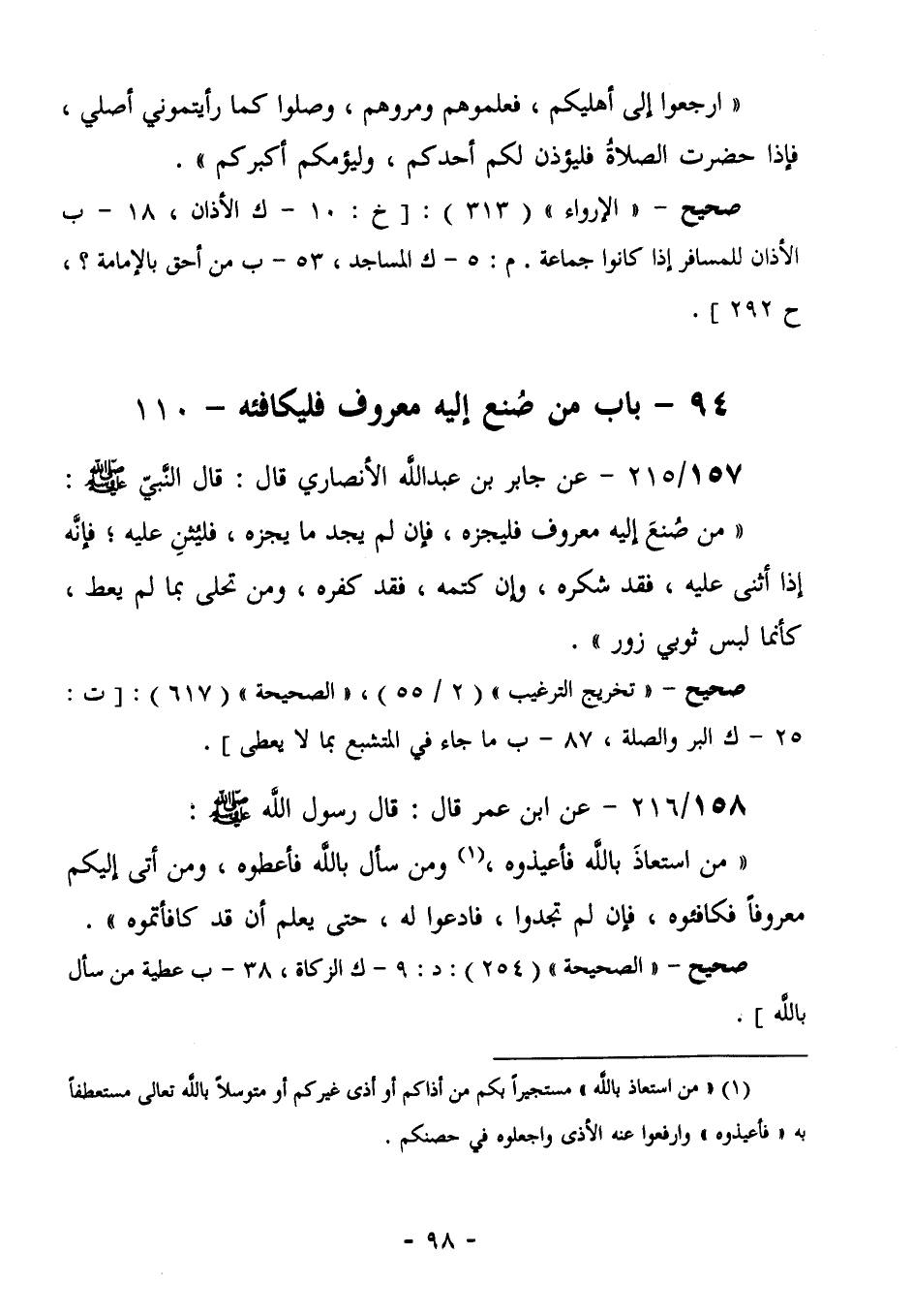 158/216 (صحيح) - عَنِ ابْنِ عُمَرَ قَالَ: قَالَ رَسُولَ اللَّهِ صَلَّى اللهُ عَلَيْهِ وَسَلَّمَ: " مَنِ اسْتَعَاذَ بِاللَّهِ فأعيذُوهُ (¬1) وَمَنْ سَأَلَ بِاللَّهِ فَأَعْطُوهُ، وَمَنْ أَتَى إِلَيْكُمْ مَعْرُوفًا فَكَافِئُوهُ، فَإِنْ لَمْ تَجِدُوا، فَادْعُوا لَهُ، حَتَّى يعلم أن قد كافأتموه".